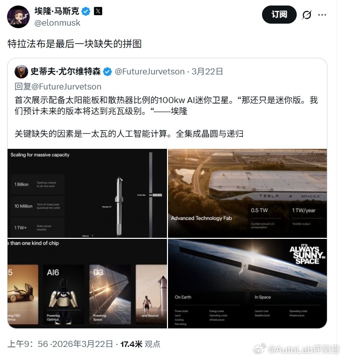 马斯克表示Terafab将是最后一块缺失的拼图。给大家回顾一下马斯克整个“拼图”的内容: