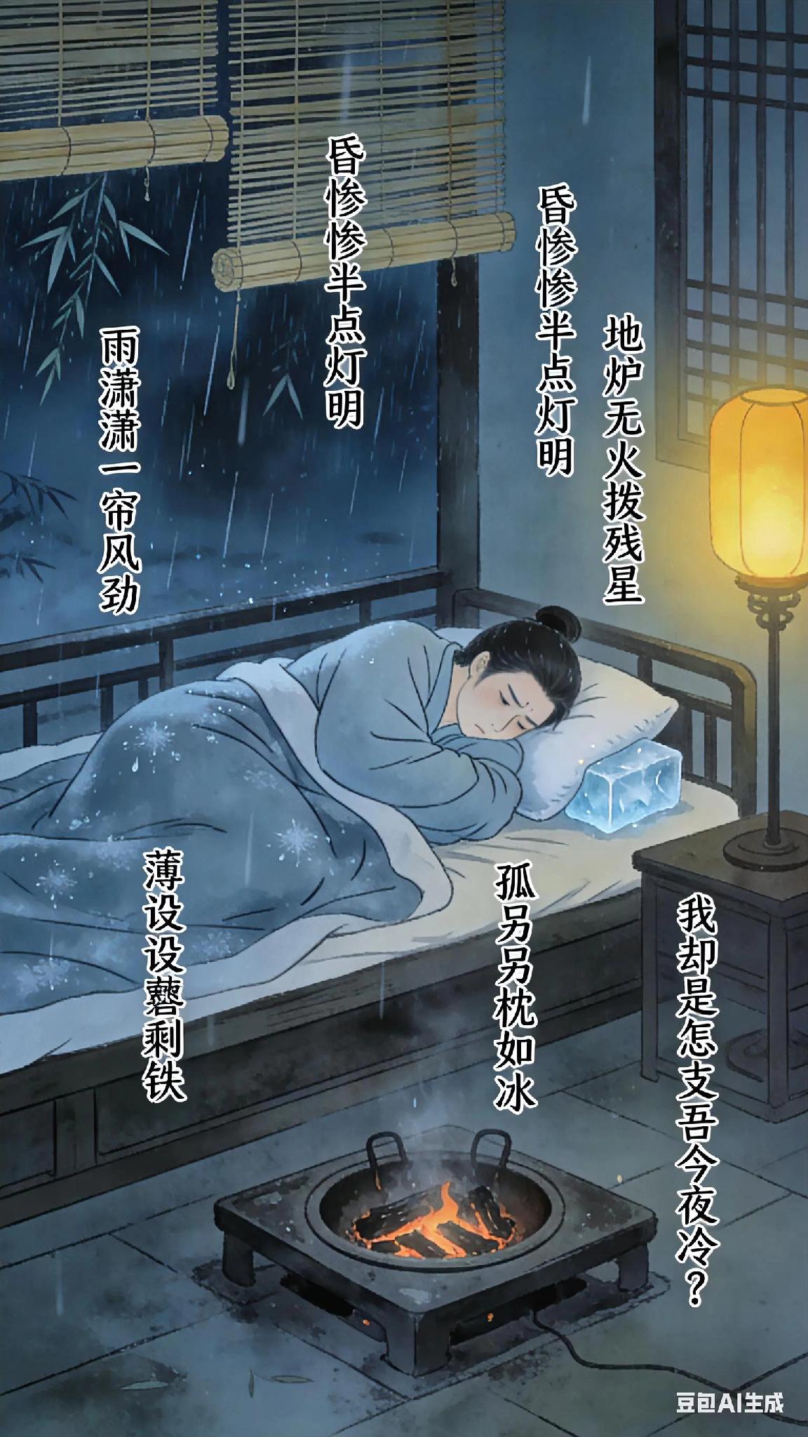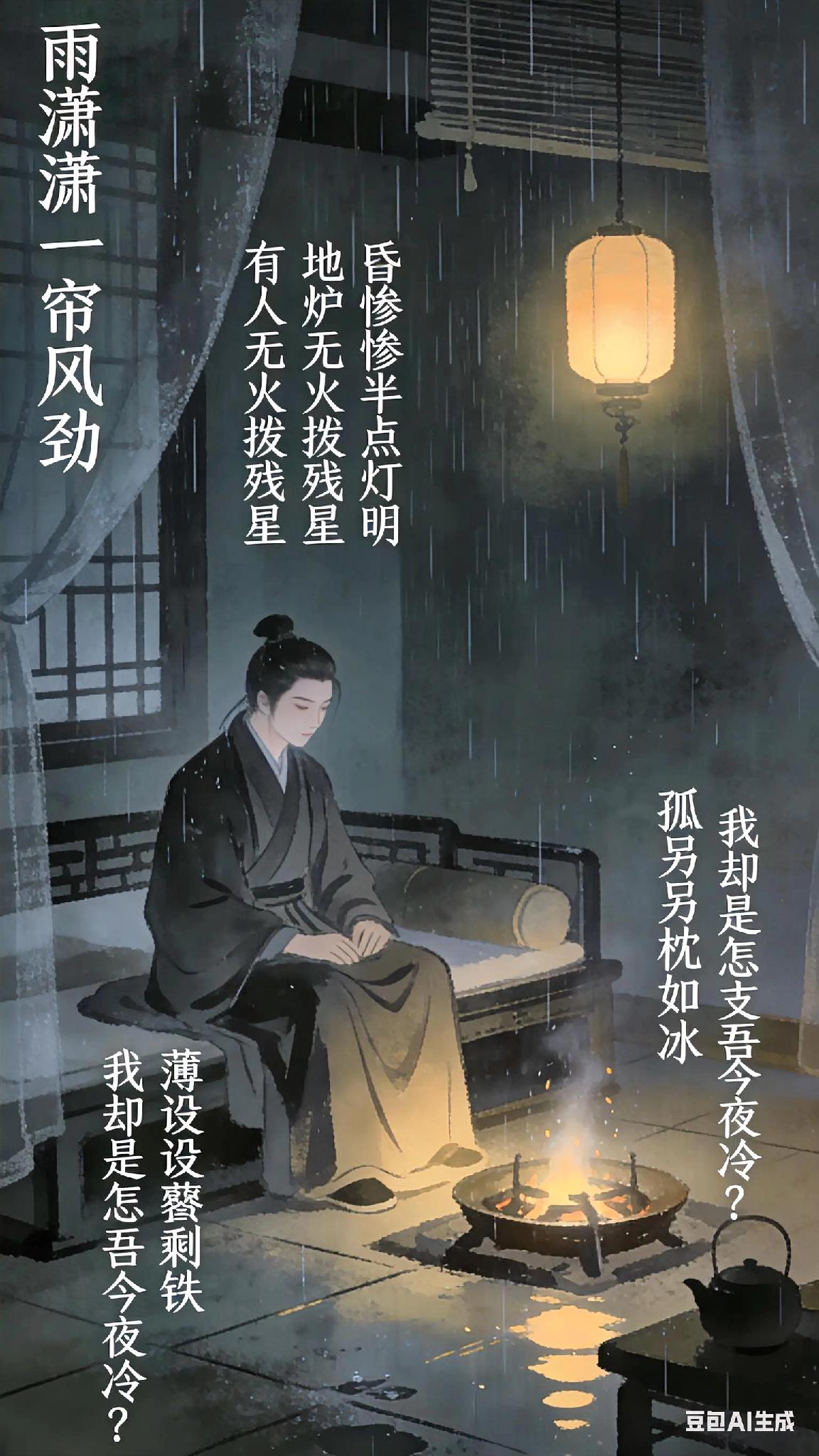 《中吕》红绣鞋客况、宋方壶。 雨潇潇一帘风劲, 昏惨惨半点灯明。 地炉无火拨残星。 薄设设衾剩铁, 孤另另枕如冰。 我却是怎支吾今夜冷? 《寒夜客愁》 现译: 雨声潇潇,冷风掀动门帘;屋内昏暗,油灯微弱摇曳。 地炉火灭,只剩几点火星。单薄的被子冷硬如铁,孤零零的枕头寒凉似冰。 这漫漫长夜,我该如何熬过刺骨的寒冷? 注:保留原曲意象,用白描手法呈现游子羁旅之孤寂,末句反问强化无奈情绪。 古诗词 你记得最深的一首古诗词是什么 你最喜欢的一句古诗词是什么 半盏清酒醉离人 初霜雨赋 饮酒敲辞雨当歌 初衣诗词 红鞋履 玉楼暮雨 古代鞋履