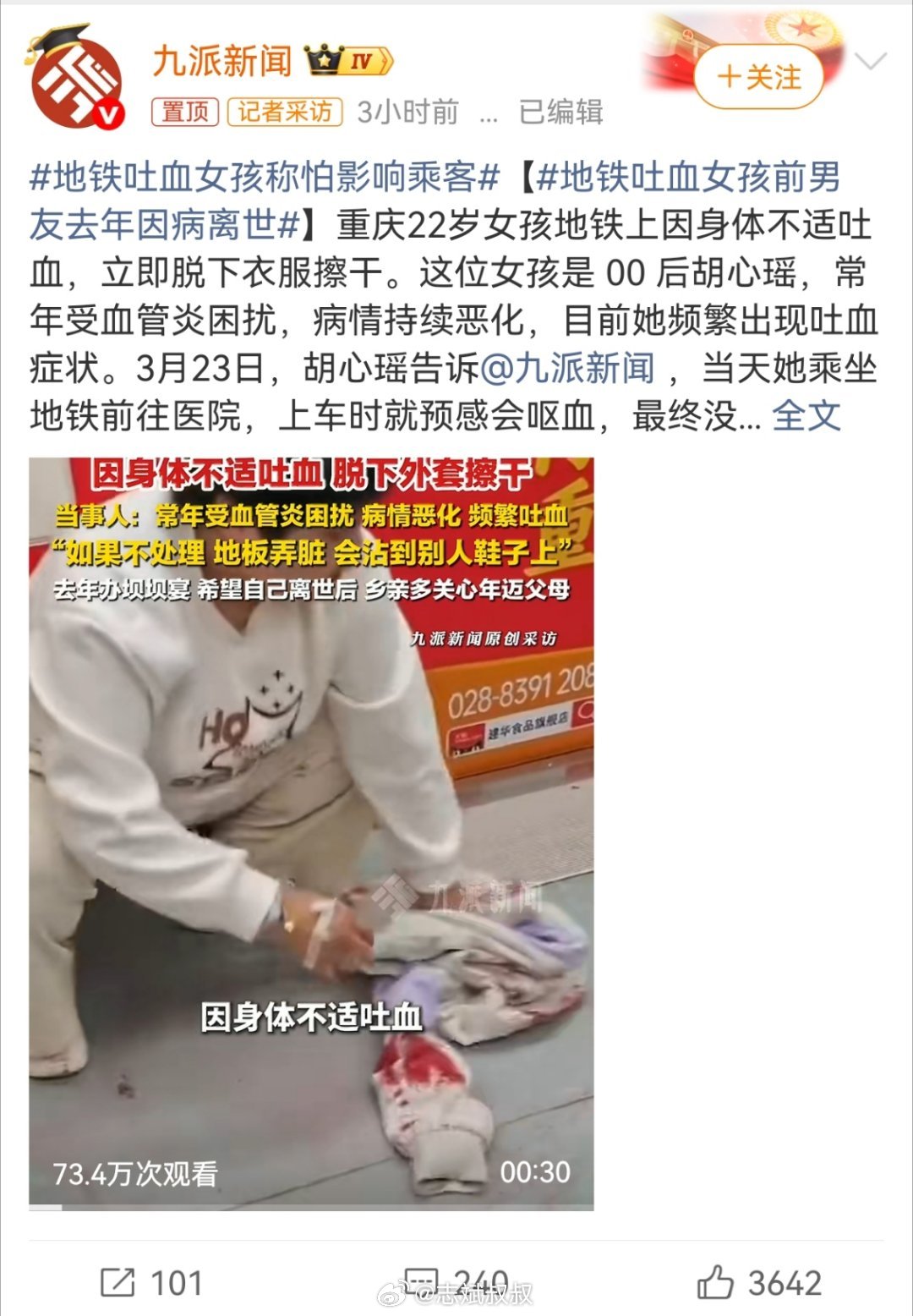 女孩地铁吐血用外套擦地,看的让人心疼