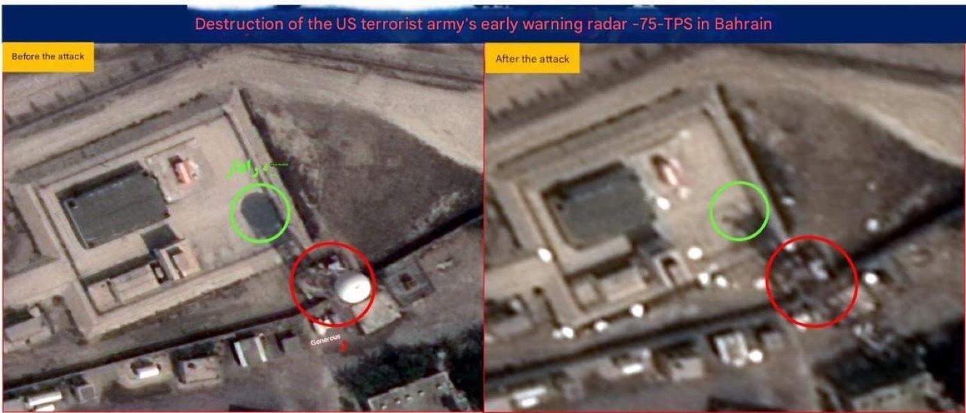 伊朗伊斯兰革命卫队公布了前后对比的卫星图像,声称其袭击了巴林的两个关键美国雷达系统——一台爱国者AN/MPQ-65火控雷达和一台TPS-75预警雷达,图像显示两者均遭到明显损坏。