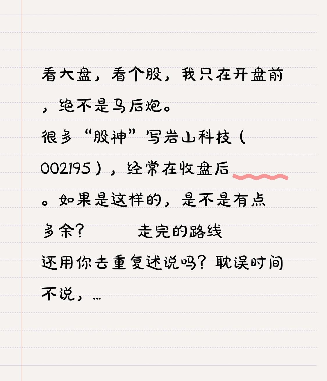看大盘,看个股,我只在开盘前,绝不是马后炮。 很多“股神”写岩山科技(002195),经常在收盘后。如果是这样的,是不是有点多余? 走完的路线还用你去重复述说吗?耽误时间不说,关键一点用没有。 还有不少“股神”,判断至少50%以上不准确。然后就说声“对不起”。 股民都知道,一步错,那亏的是人民币,不是一句对不起能解决的。 所以,炒股要靠自己,不要看任何评论。 当然,包括我自己[捂脸]