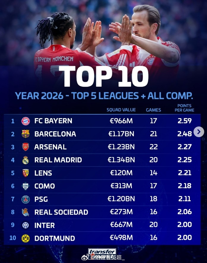 五大联赛球队2026年场均积分榜:1、拜仁 17场,2.59分2、巴萨 21场,