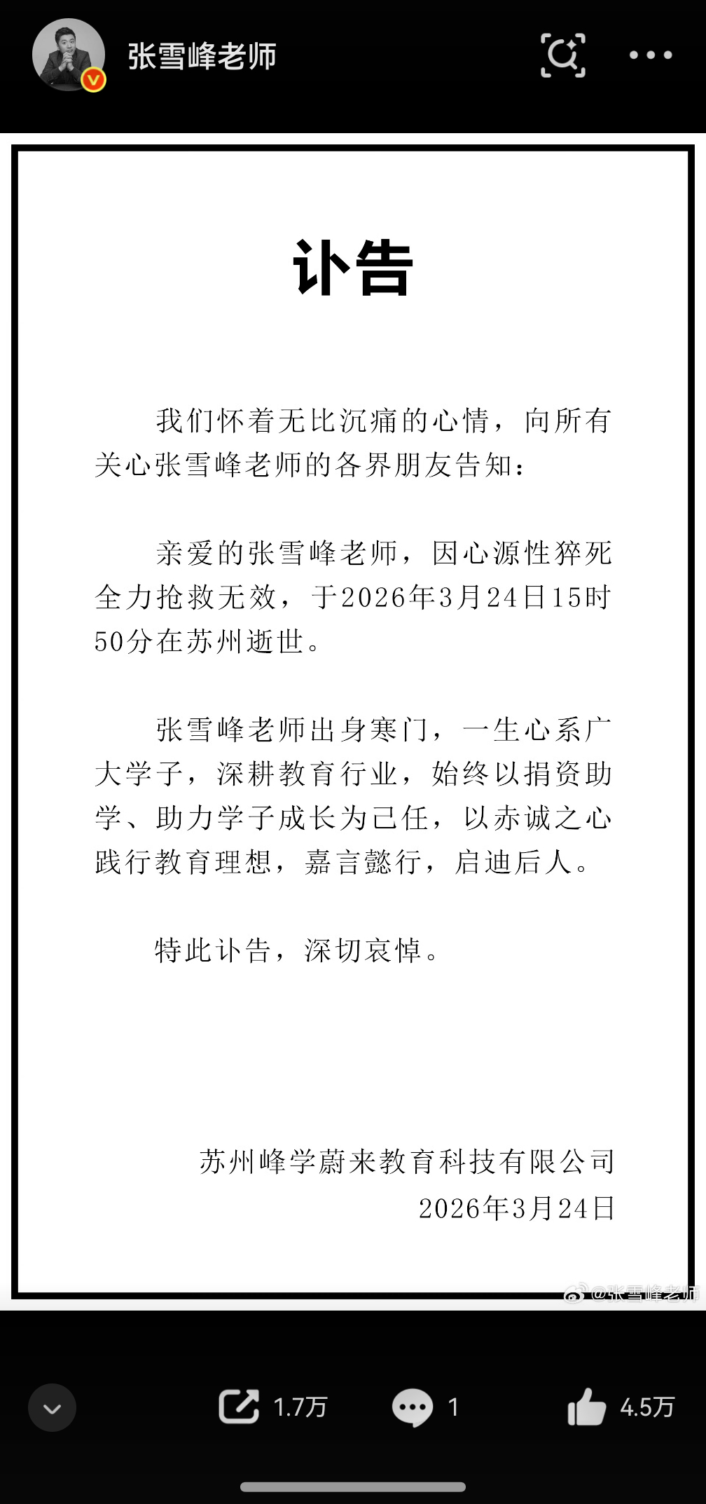 张雪峰去世 张雪峰老师,一路走好。您确实做到了,成为了一代人的回忆。到现在都不敢相信这条新闻,真的太突然太震惊了。