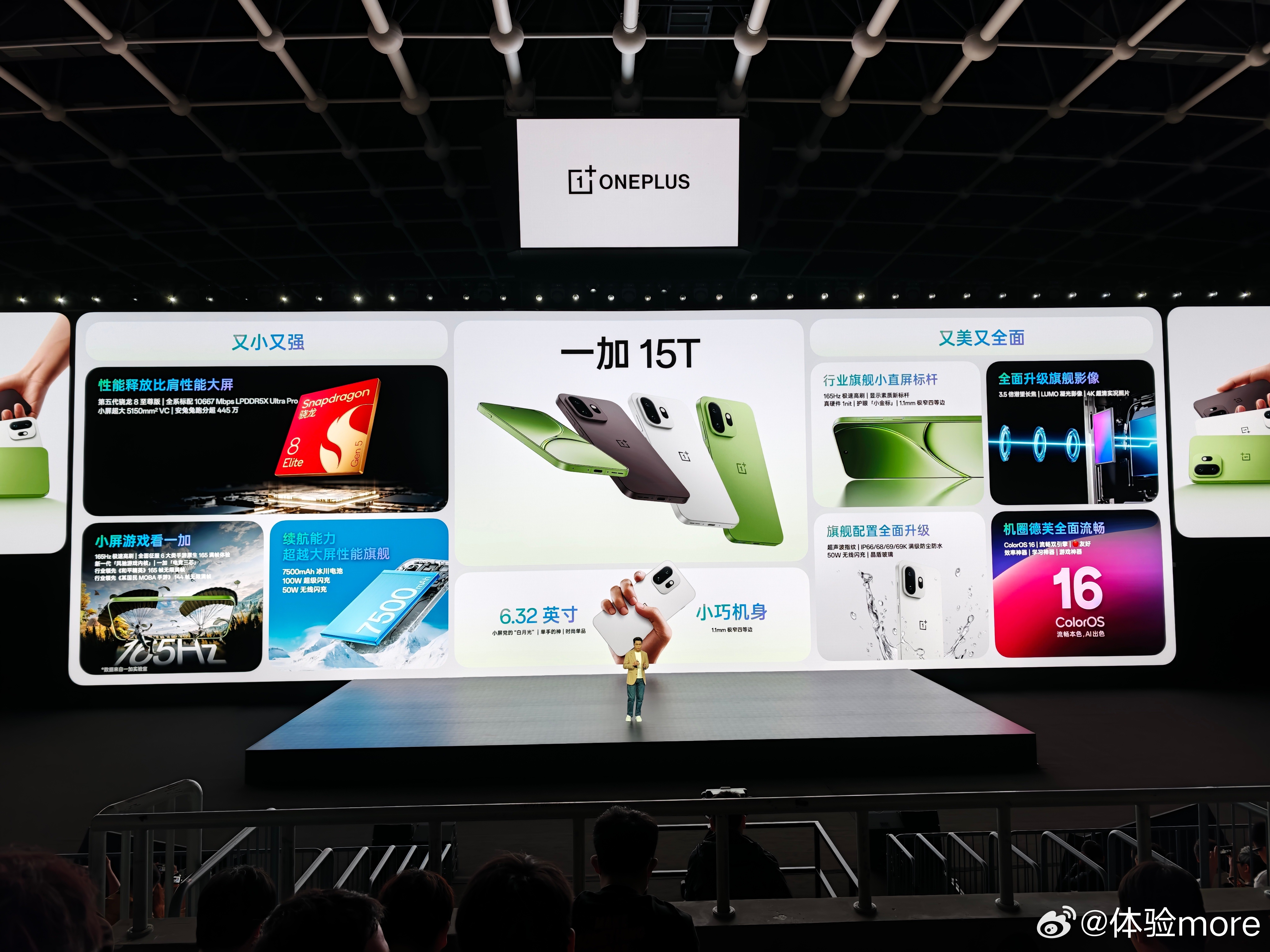 一加 15T部分规格:骁龙8 Elite Gen 5+LPDDR5X Ultra Pro+UFS4.1,6.32英寸1.5K LTPS直屏,1.1mm四等窄,前置16MP,后置50MP IMX906 1/1.56 OIS主摄+50MP JN5 f/2.8 3.5X 85mm OIS潜望长焦,100W+50W+7500mAh,金属中框+玻纤后盖,AI键,3D超声波指纹,IP66/IP68/IP69/IP69K满级防尘防水,电竞三芯,晶盾玻璃等等,150.56*71.82*8.48mm,194g。