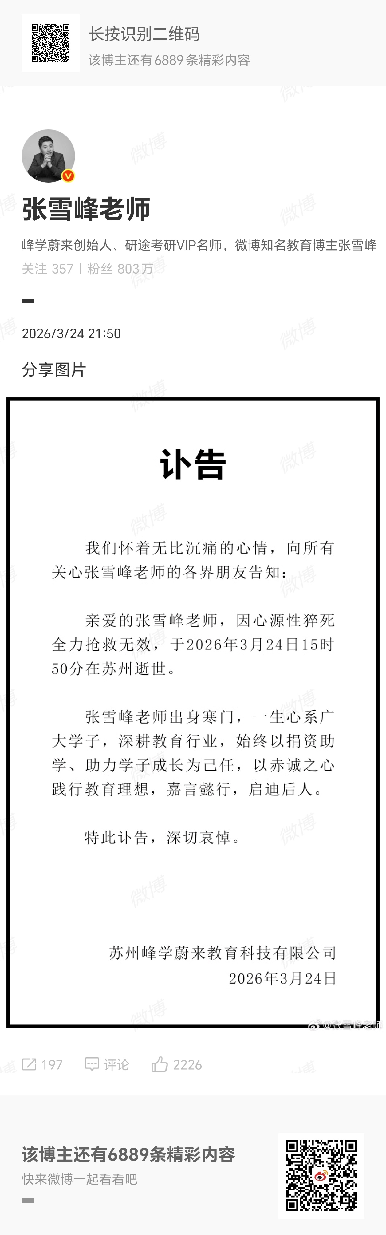 张雪峰去世啊????