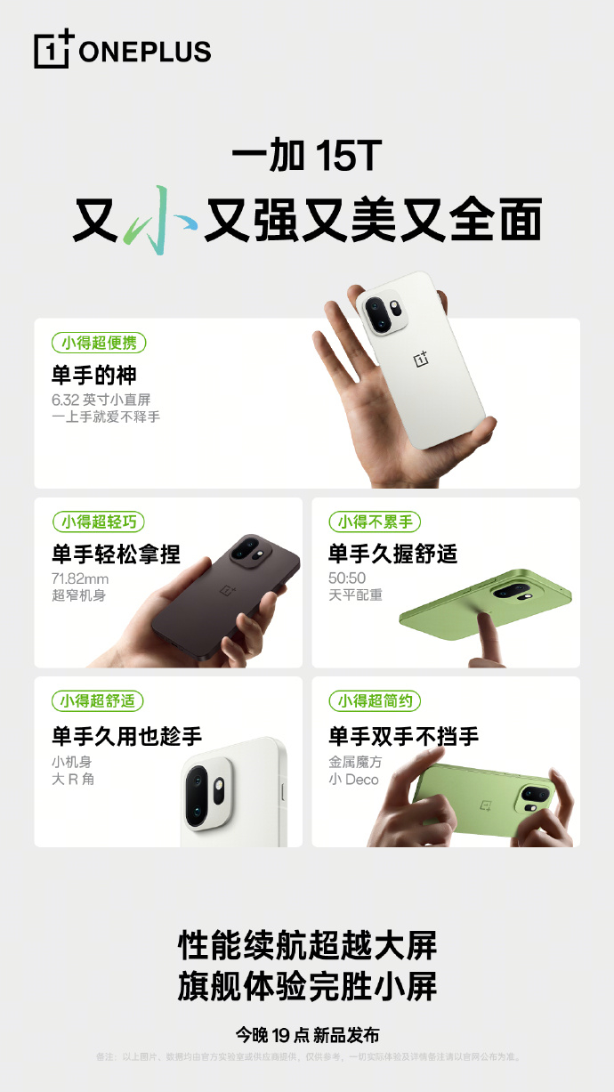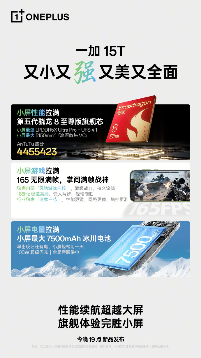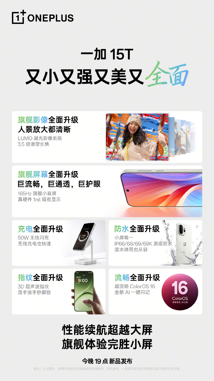 再来看一眼一加15T核心配置:骁龙 8 Elite Gen5,LPDDR5X Ultra + UFS 4.1自研「风驰游戏内核」+ 电竞三芯,原生 165Hz《无畏契约》首批适配6.32" 1.5K LTPS 小直屏,165Hz 刷新率(小屏唯一)1.1mm LIPO 物理四等窄 + 黄金大 R 角71.82mm 宽度,194g,50:50 天平配重7500mAh 冰川电池,100W 有线 + 50W 无线,支持旁路供电搭载5000万 潜望长焦(3.5X / 85mm,OIS)OPPO 旗舰同款 Lumo 凝光影像算法金属中框 + 玻璃后盖,微弧氧化纯白金属中框(白色版)3D 超声波指纹,IP66/68/69/69K 满级防水独立快捷键(8种自定义),磁吸散热生态三款配色:纯粹可可 / 松弛抹茶 / 治愈白巧
