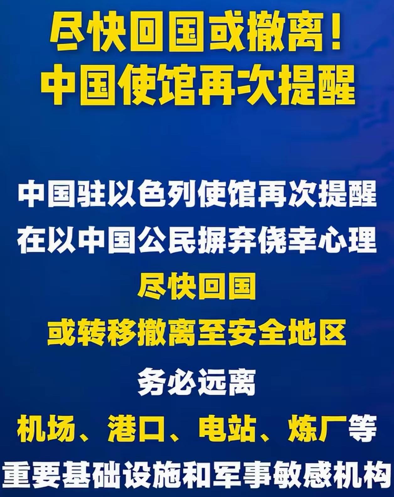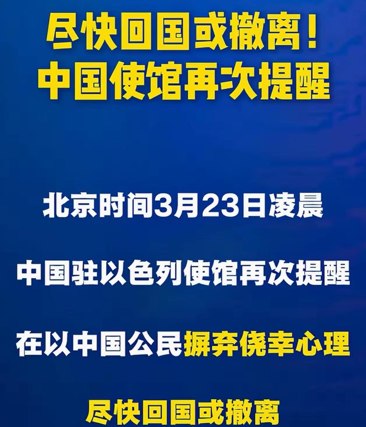 在以色列的中国公民赶紧回国!!! 中国大使馆再次提醒,在以色列的中国公民赶紧回国,或转移到安全地带。 可以看出,目前以色列已处于高危地区,伊朗的打击,严重威胁到每一个在以色列的中国公民。 战争是无情的,导弹也是不长眼的,呆在那边,生命安全根本得不到保障,一旦为了赚钱,把命抖丢那边不值得。 大家说是不是?伊朗以色列状况 以色列出事 以色列外交现状 以色列地理风险 美国人在以色列 外国以色列 美国以色列撤侨