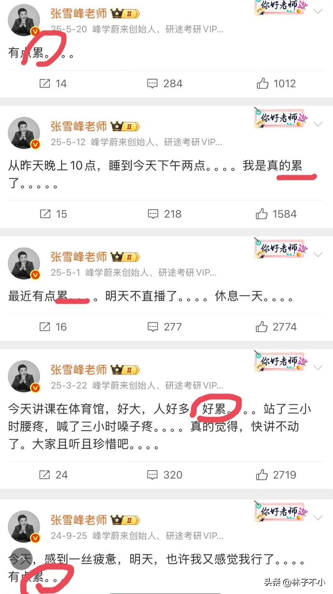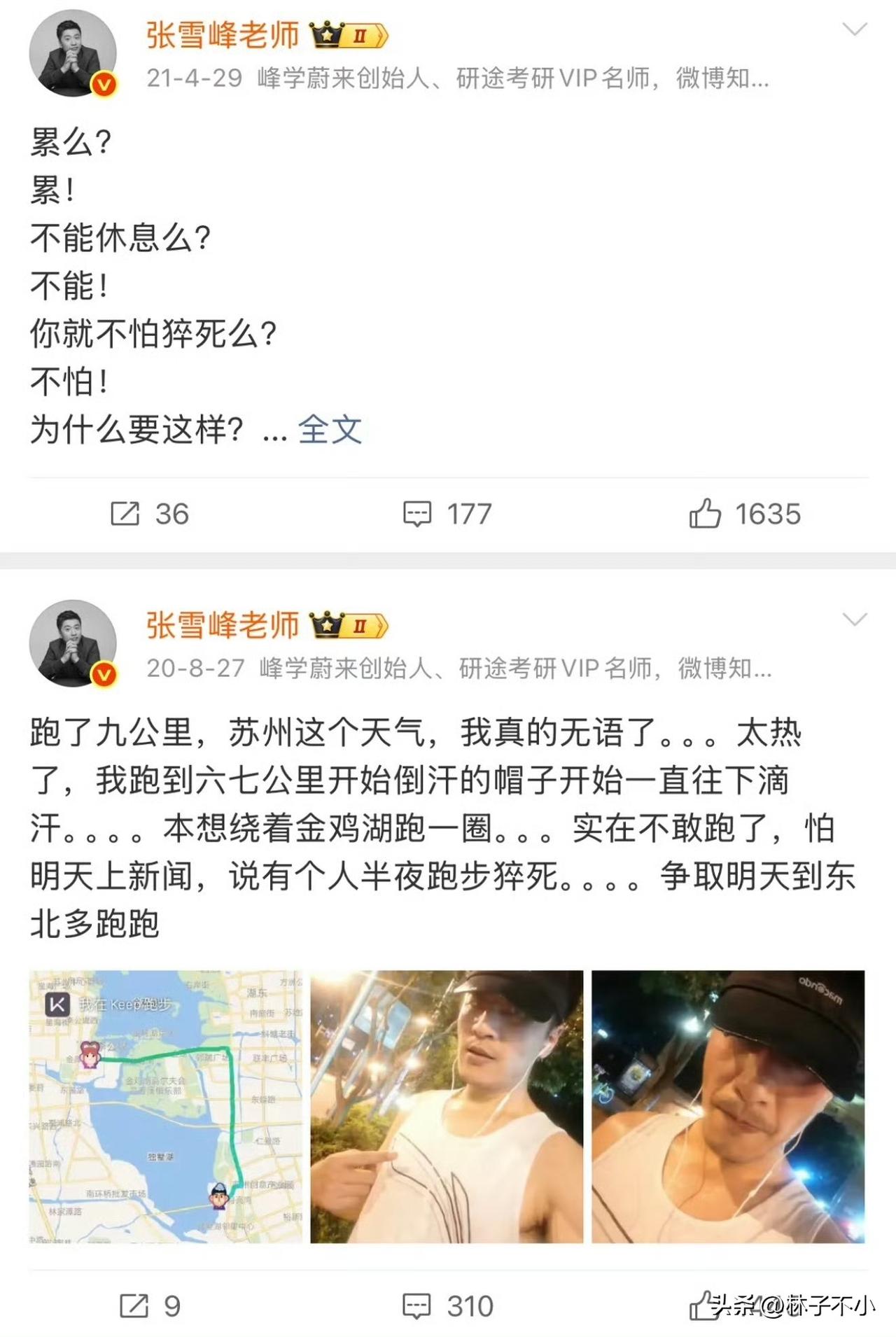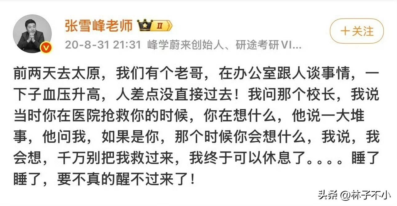 张雪峰早就预测了自己结局! 下面这些就是最好的证明。 2016年他曾在微博里提到自己一夜未睡,看到过一个猝死的新闻,希望这事不要发生在在自己身上。 2017年他发微博,他说再这样下去会不会猝死,因为他知道自己的工作强度有多大,他在担心。 2018年他说选择一种死法,希望是猝死,对于时间,他说希望是不久的将来。但是对于这个说法,很多人都会以为他在调侃,又有谁会希望自己早逝! 2020年他曾跟朋友说,如果自己昏迷,希望不要抢救自己,自己就可以好好休息了,这说明他的过往真的很累。 2021年至2025年,他的微博中提到的高频词就是“累”。 这一切都在说明张雪峰是在超负荷生活,所以他预感到将来猝死有可能会发生在自己身上,但没想到会真的发生。 (素材来源于网络) 张雪峰去世 年仅41岁