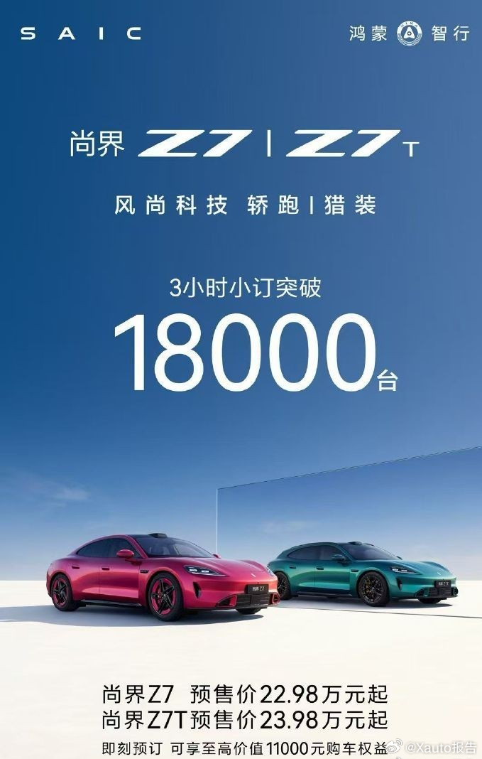 尚界Z7小订24小时突破25000台尚界Z7/Z7T预售24小时小订破25000台,预售价22.98万起、23.98万起。全系标配华为激光雷达、途灵平台等13大科技,市场热度高涨,上市表现备受期待。尚界Z7三小时小订突破18000台尚界Z7预售价格22.98万起尚界Z7全系标配13大真香科技配置尚界z7尚界z7t新能源汽车