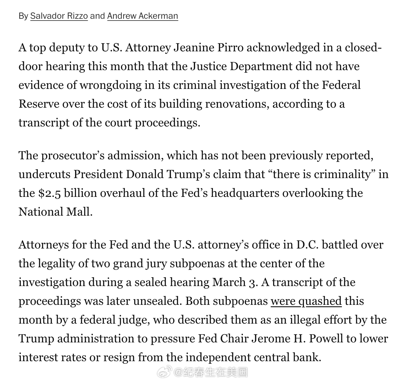 美国联邦检察官 Jeanine Pirro 的一名高级副手在本月的一场闭门听证会上承认,司法部在针对美联储 大楼翻修费用的刑事调查中,并没有掌握任何违法证据。