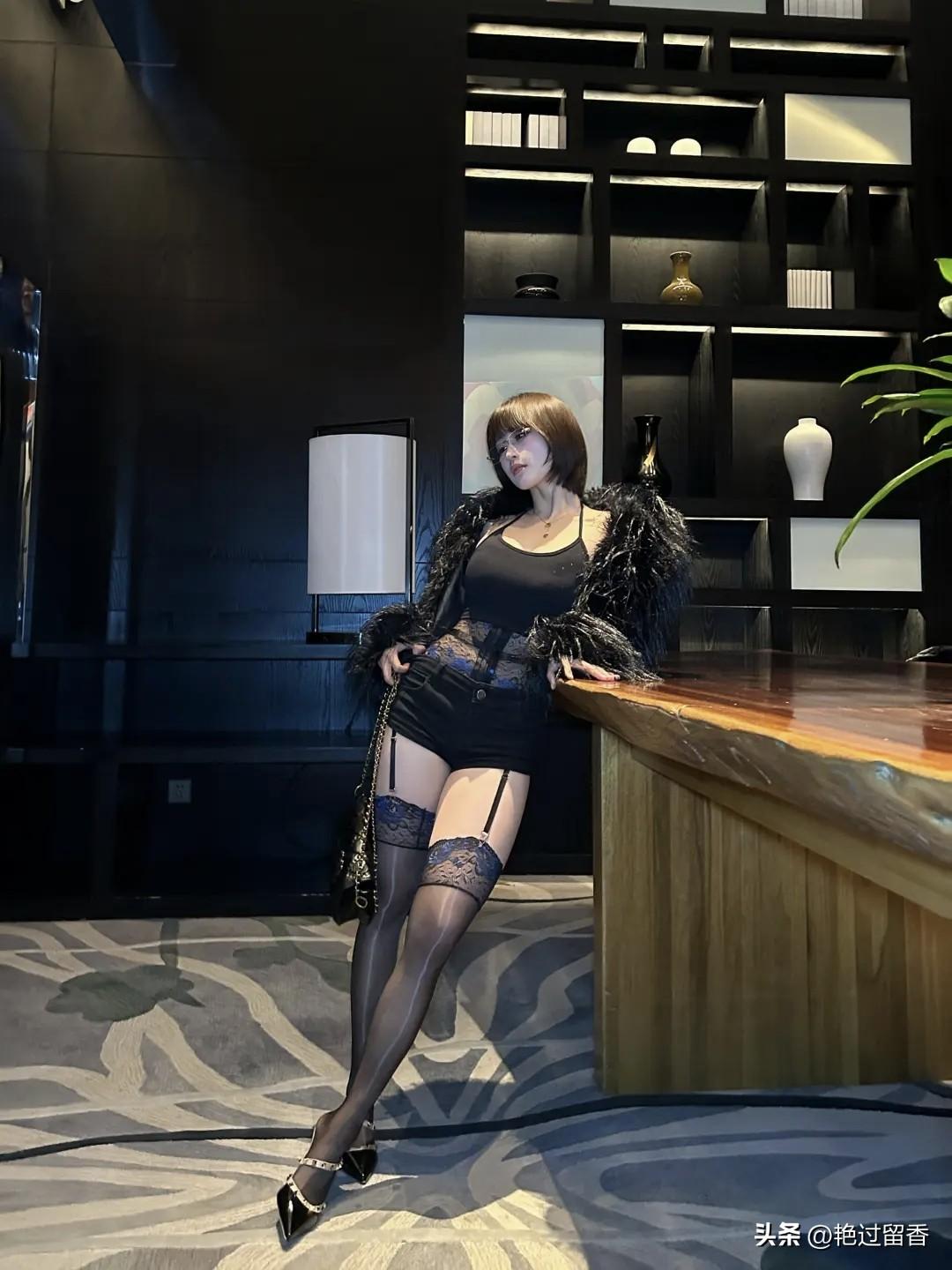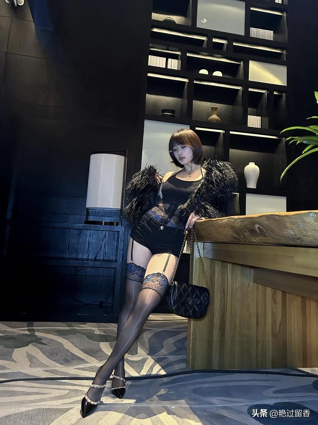 都市酷炫风穿搭,黑色透视装搭配羽毛外套,时尚感爆棚!