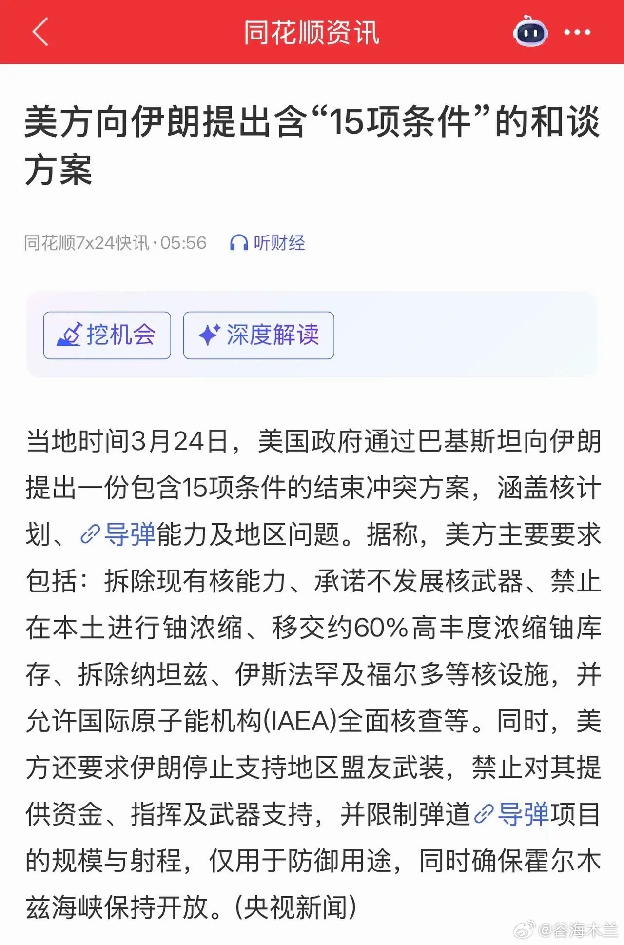 周三开盘前,新华社、央视新闻同步发布重要消息:美国拟对伊朗停火一个月,并提出15点谈判协议,核心要求如下: