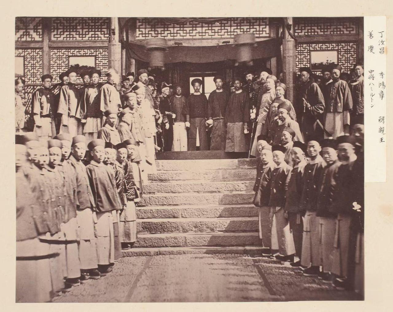 1886年,北洋海防大阅的“全明星”合影。这张照片是中国近代海军史上极具分量的一张合影,拍摄于1886年5月,醇亲王奕譞居中,李鸿章、善庆、丁汝昌及英国海军中将哈密尔顿分列两侧,记录了醇亲王奕譞奉旨巡阅北洋海防时的重要瞬间。 照片右侧的题字清晰标注了核心人物:北洋水师提督丁汝昌、直隶总督,北洋水师的缔造者李鸿章、正红旗汉军都统,会办海军事务大臣善庆、光绪帝生父,总理海军事务大臣醇亲王(奕譞)、英国远东舰队中将司令,代表西方观礼。