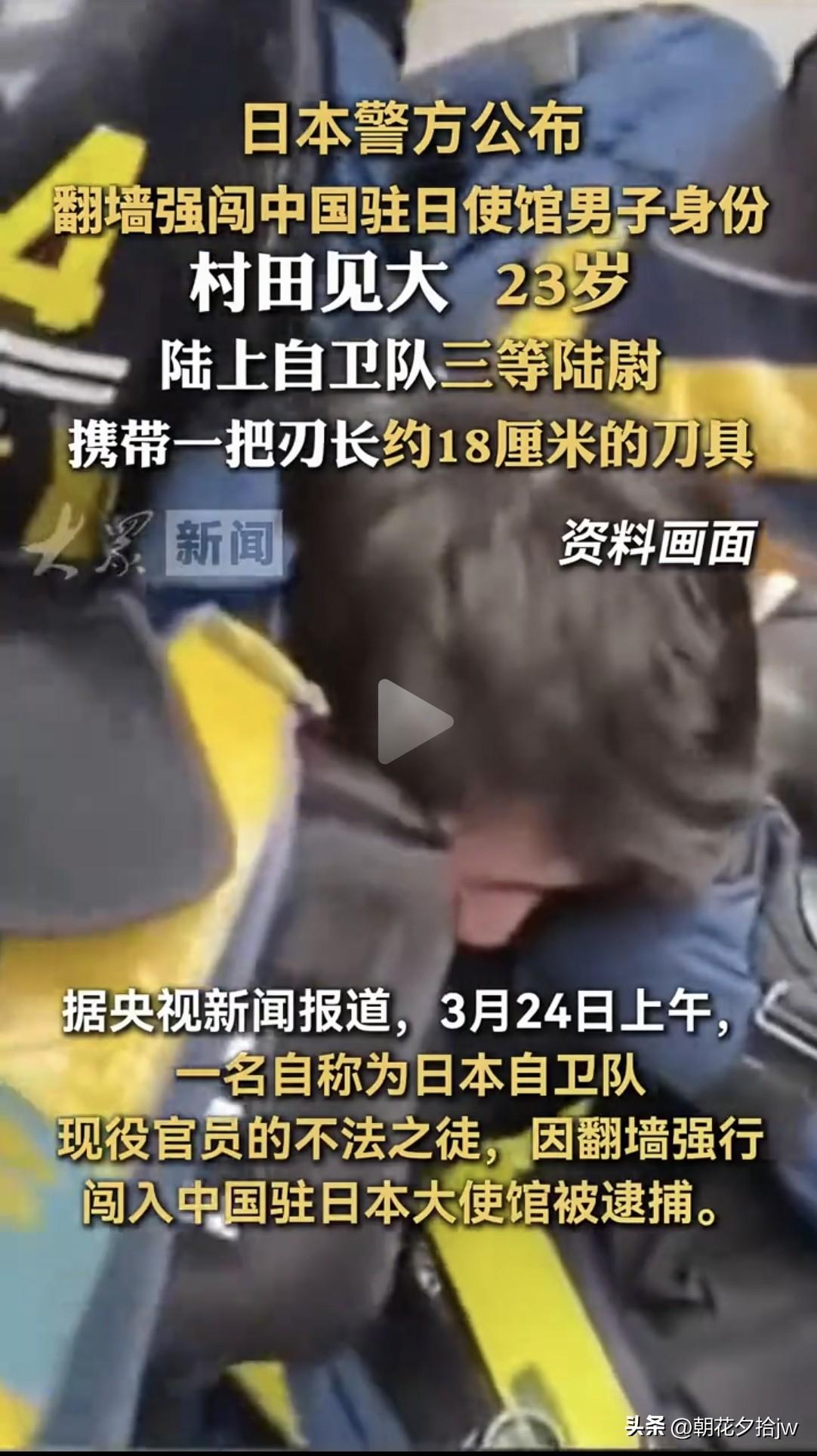 调查结果来了! 携刀闯中使 馆男子被逮捕。 姓名:村田见大 年龄:23岁 职务:三等陆尉 身份:现役军人 原因: 持18Cm刀 具翻墙进入中使 馆,扬言以“神”的名义刺杀中方外交人员。 众所周知,他所指的“神”是谁! 问题是,一个23岁步兵少尉,哪来的胆子如此猖狂? 到底受谁指使? 这才是重 点!