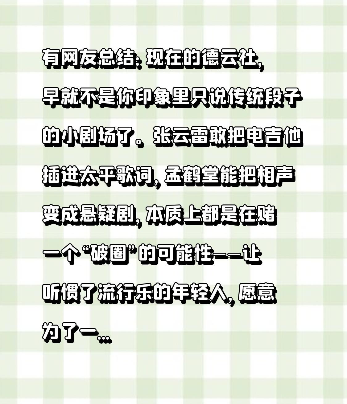 德云社又炸热搜!张云雷新活玩出花,粉丝:这波操作把我CPU干烧了 要说内娱谁最会“搞事情”,德云社认第二,没人敢认第一!就这三天,角儿们愣是把热搜玩成了自家“打卡地”,其中张云雷的新活儿,直接把粉丝的好奇心勾到了嗓子眼儿—— “辫儿哥又整新花活了?这次是要把传统曲艺玩出赛博朋克风?” 事情是这样的:在最新一场小剧场演出里,张云雷抱着他的御用电吉他,突然就对传统太平歌词《白蛇传》下了“狠手”。前奏一起,还是那熟悉的京韵大鼓调调,可到了副歌,电吉他失真音效直接拉满,他一边甩着标志性的大褂水袖,一边对着麦克风嘶吼“青城山下白素贞”,台下观众从一脸懵到集体蹦迪,氛围直接嗨成了livehouse。 更绝的是,演出结束后他往社交平台一扔视频,配文就仨字:“尝尝鲜?” 结果评论区直接炸锅—— “哥,你这是把非遗改成了‘非遗摇’啊!” “建议直接改名叫‘德云摇滚社’得了!” 还有人扒出,他为了这版改编,偷偷请教了圈内知名摇滚制作人,光编曲就磨了半个月,就为了“让老玩意儿在年轻人耳朵里活过来”。 这还不算完,德云社的热搜体质是“组团”来的。这边张云雷刚靠“非遗摇滚”霸占热搜,那边孟鹤堂周九良的“相声悬疑剧”又杀了出来—— 他俩新段子《谁偷了我的大褂》,把传统相声的“铺平垫稳”玩成了刑侦推理:孟鹤堂扮演的“侦探”,靠着周九良抖的一个个“包袱线索”,愣是在二十分钟里破解了“大褂失窃案”,最后揭晓真相时,台下观众集体拍大腿:“合着这是把《明侦》搬进了相声园子啊!” 有网友总结:现在的德云社,早就不是你印象里只说传统段子的小剧场了。张云雷敢把电吉他插进太平歌词,孟鹤堂能把相声变成悬疑剧,本质上都是在赌一个“破圈”的可能性——让听惯了流行乐的年轻人,愿意为了一段改编的太平歌词多停留几秒;让沉迷剧本杀的00后,觉得“原来相声还能这么玩”。 这三天的热搜,与其说是德云社在“搞事”,不如说是他们在给行业打样:传统文化从来不是死的,只要愿意扎进年轻人的语境里,拿新瓶装旧酒,照样能让“老玩意儿”炸穿热搜。 你别说,就冲这股敢折腾的劲儿,下一个热搜我已经开始期待了——说不定哪天,郭麒麟就带着相声上《说唱新世代》了呢?男歌手张云雷 头九德云社