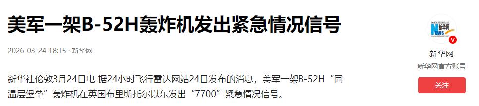 情况危急,美军空中战略核打击力量出事了 3月24日,从24小时飞行雷达网站传来一个重磅消息——一架美军战略轰炸机出事了。 这架轰炸机的型号是B-52H,绰号“同温层堡垒”,是美国研制的B-52轰炸机发展型的最后的一个型号。 这架飞机从1961年就开始服役,至今已经用了60多年,美军计划让它一直用到2050年,算下来服役时间能达到90年,堪称美军的“老古董”轰炸机。 它是美军战略轰炸机当中唯一能发射巡航导弹的型号,最大载弹量能达到31吨,既能装常规炸弹,也能装核弹,最大航程有16000公里,不用空中加油,就能从美国本土飞到欧洲、亚太地区执行任务,是美军核打击力量的重要组成部分,平时经常在世界各地飞,炫耀武力。 目前美军现役还有76架左右的B-52H,一直是他们空中战略威慑的核心力量。 3月24号那天,这架B-52H正在英国南海岸的上空飞行,具体位置就在布里斯托尔以东,飞行高度大概有3000多米。 突然,这架飞机就出了状况,24小时飞行雷达网站实时监测到,它发出了“7700”紧急信号。大家记住这个信号,这是国际通用的紧急情况代码,只要飞机发出这个信号,就说明机上遇到了紧急状况,可能是机械故障、人员问题,也可能是其他危及飞行安全的情况,必须马上处置。 信号发出后,这架B-52H没有继续向前飞行,而是在原地盘旋,随后开始慢慢下降高度,看得出来,机组人员当时很紧张,正在紧急处置险情。 根据外媒报道,这架飞机当时准备返回位于英国格洛斯特郡的皇家空军费尔福德基地,那里是美军在欧洲部署轰炸机的重要基地之一,平时经常有美军的战略轰炸机在那里起降、停靠。 至于具体是什么原因导致的紧急情况,目前还没有明确的官方通报,但有媒体推测,可能和机舱失压有关。 简单说,就是机舱里的压力出了问题,要是不及时处置,机组人员会因为缺氧出现危险,严重的还会影响飞机的正常飞行,所以才会紧急下降高度、准备迫降。截至目前,还没有听说这架飞机有人员伤亡,也没有公布飞机是否受损,事故原因还在进一步调查中。 其实,这已经不是美军B-52H第一次出事了。就在去年2月,有一架B-52H从美军迈诺特空军基地起飞后,一台发动机突然起火,机组人员只能紧急迫降,好在最后火被扑灭,没有造成人员伤亡,但飞机肯定受到了损坏。 还有去年7月,北达科他州的一个机场,一架支线客机准备降落时,突然发现前方有一架B-52H,差点就撞上,多亏客机机长反应快,紧急规避才没出大事。 大家可能会疑惑,这么老的飞机,美军为什么还一直在用?主要是因为它的性价比高,而且经过多次改进,还能适应现代战争的需求。 美军曾经对B-52H进行过升级,更换了新的发动机和雷达,让它能携带更多种类的武器,继续发挥作用。 但毕竟已经服役了60多年,设备老化的问题越来越严重,再加上美军可能在维护上不到位,所以最近几年,B-52H的事故越来越频繁。 这次B-52H出事,看似是一次普通的军机故障,但背后也反映出美军空中战略力量的短板。要知道,这架飞机是能携带核弹的,要是在飞行中出大问题,比如坠毁,不仅会造成人员伤亡,还可能引发核泄漏,危害周边的环境和居民安全,后果不堪设想。 而且最近这几年,美军的军机事故越来越多,不管是轰炸机、战斗机,还是客机,经常出现故障、相撞的情况,这也能看出来,美军的装备维护和管理,可能存在不少问题。 美军一直靠着强大的军事力量,在世界各地搞军事威慑,频繁派出战略轰炸机、军舰到其他国家周边挑衅,炫耀自己的实力。 但这次B-52H出事,也让大家看到,他们的军事力量并不是不可战胜的,再强大的装备,要是老化严重、维护不当,也会出问题。 这件事虽然只是一次军机紧急情况,但从一个侧面反映出,美军的空中战略核打击力量,已经出现了隐患。 随着装备越来越老化,后续可能还会出现更多类似的事故。而美军要是不重视这些问题,不及时改进装备、加强维护,未来他们的空中威慑力,只会越来越弱。 这也告诉我们,一个国家的军事力量,不仅要看装备的先进程度,更要看装备的维护和管理水平,只有把基础做好,才能真正形成强大的战斗力。