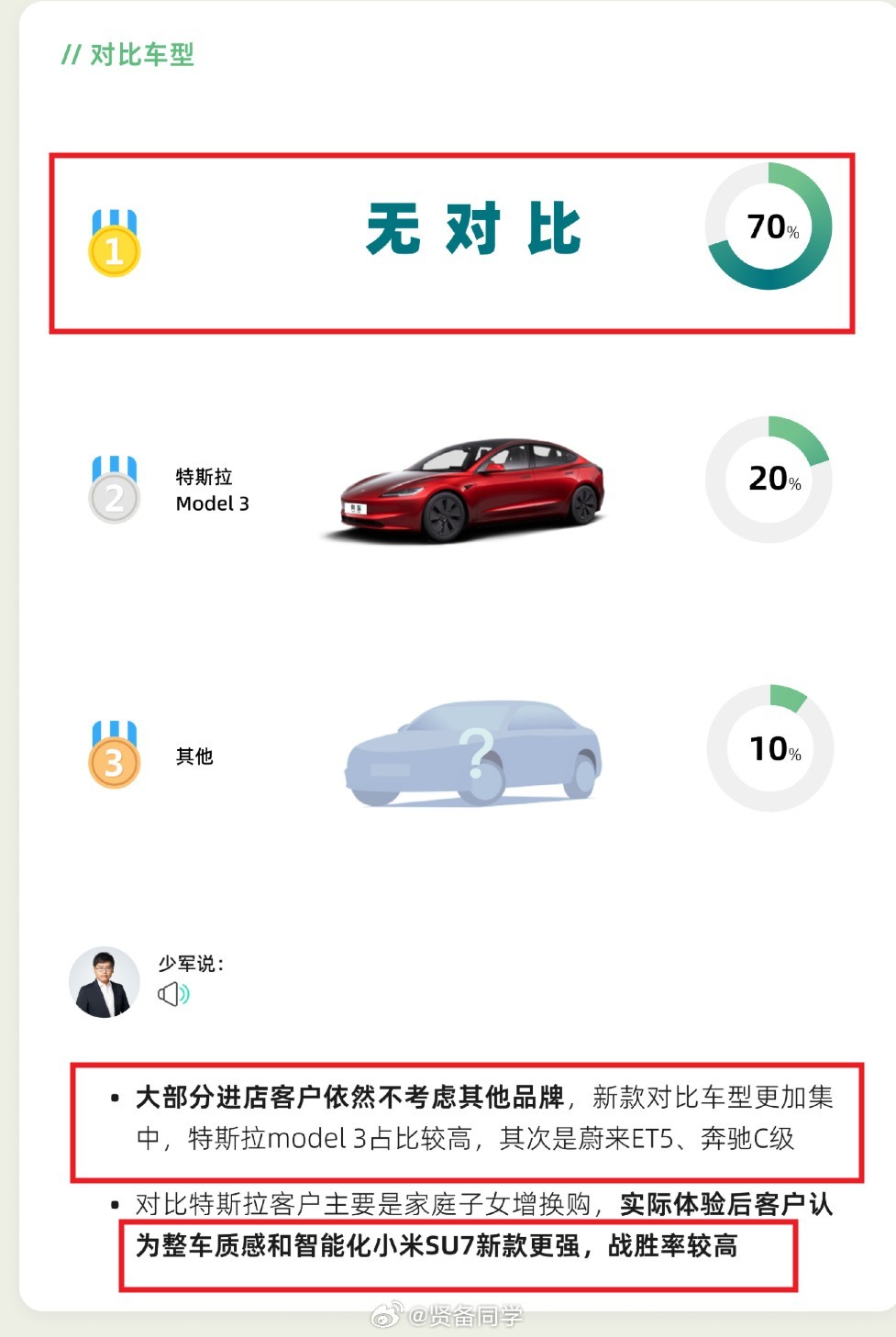 其二是选择了新一代小米SU7的客户情况,特别是竞品对比中提到:10个里面,7个不考虑其他品牌,2个对比特斯拉model 3,1个对比其他