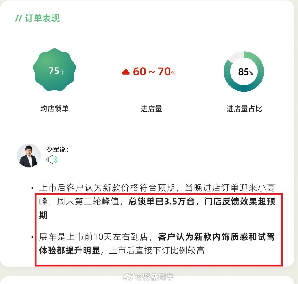 首先是锁单数据,小米官方披露的是72小时锁单超30000辆;少军这边披露的数据更明确,目前锁单量达到了35000辆,这么看小米这边披露的还是比较低调的。这个数据对比初代的锁单节点,确实是更加进步的。