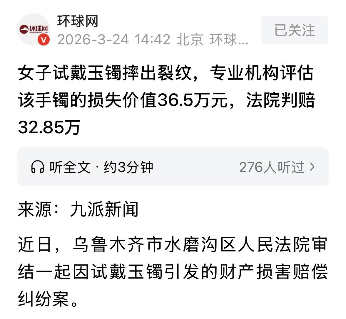 新疆乌鲁木齐,女子在店里试戴一款价值不菲的玉镯,店员嘱咐她不要拿托盘,要拿镯子本身,女子不听,执意拿起托盘试戴,结果一个没拿稳,镯子从托盘上滑落磕到柜台,当场磕出裂纹,女子承认是自己疏忽导致,可当她听到损失价值高达36.5万时,立马翻脸不认了。双方因此闹上法庭,结局让女子出乎意料! 2025年8月,刘女士逛进店里,一眼相中了一只标价不菲的玉镯。 店员看她要上手,特意嘱咐了一句:拿镯子本身,别拿托架。 这话说得够明白了,托架不稳,容易出事。 可刘女士还是抓了托架。意外就在一瞬间,手一滑,玉镯啪一声撞在柜台玻璃上,一道明显的裂纹瞬间显现。 当时在场的人都心里一紧,这下完了。 跟着刘女士来的朋友赵先生,一看这架势,为了帮朋友解围,当场把自己的车押给了店主,还白纸黑字签了个保证书,说要是刘女士赔不起,他来担责。 事后,店家觉得特别冤。柜台上铺了软垫,也口头提醒了,是刘女士自己不听劝,非要拿托架,这损失必须她全赔。 刘女士在沟通时倒是认账,承认是自己手滑弄掉的,也认可是自己的责任。 但这玉镯太贵了,当商家拿出36.5万元的损失评估报告时,刘女士傻眼了。 她立马翻脸不认人,说镯子肯定不值这么多钱,店家坑她呢! 店家看刘女士这态度,直接告上法院,要求她赔钱。 到法庭上,刘女士说,这镯子可能本来就有“暗伤”,是试戴时自己裂开的,不是摔坏的。 而且她觉得店家作为专业卖家,为啥不让店员直接递到手上?为啥没有防滑托盘?安全措施没做到位,店家也得背锅。 赵先生这时候也想往后缩,他说车已经押过了,担保解除了,就算要赔钱,也得是“一般保证”。也就是得先把刘女士的家底掏空执行完了,剩下的零头他才补。 法官审理认为,刘女士是个成年人,买这种易碎的贵重东西,得打起十二分精神。 店员明明说了不能拿托架,她偏要拿,这就是“重大过失”,是把镯子摔碎的主要原因,得负主责。 但店家也不是完全没责任。虽然铺了软垫也提醒了,但这镯子价值几十万,光靠口头提醒确实不够保险,如果当时店员亲手递过去,或者全程帮忙戴,这事大概率就不会发生。 所以店家在安全保障上有点小疏漏,得自负一点损失。 最后法院拍板:刘女士担九成责,店家担一成。那36.5万的损失费,刘女士得赔32.85万元。 至于赵先生,他的“一般保证”有效,也就是说,只有在刘女士名下房产、存款都被强制执行完还不够赔的时候,赵先生才需要掏腰包补窟窿。 判决一下来,这事算是定了调。刘女士因为一时手欠,不仅赔了一大笔钱,还把朋友的车和信誉都搭进去了,真是糊涂! 《民法典》第1165条规定:行为人因过错侵害他人民事权益造成损害的,应当承担侵权责任。依照法律规定推定行为人有过错,其不能证明自己没有过错的,应当承担侵权责任。 刘女士作为完全民事行为能力人,无视店员“不能拿托架”的明确警示,因重大过失导致玉镯滑落,是损害发生的主因,应担主责。 商家虽有提示和软垫,但面对高价值玉器未采取专人递送等更高等级防护措施,存在防范不足的轻微过错。 法院依据双方过错程度划分90%与10%的责任,既体现了对受害人过失的追责,也督促经营者尽到更充分的安全保障义务,符合公平原则。 对此,你怎么看? 关注@运良说法 学法律知识不迷路