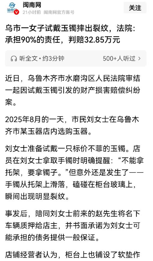 新疆乌鲁木齐,女子在玉器店看中一只价值百万的手镯,店员提醒她不要拿托架,要拿手镯,女子不听,结果玉镯磕到玻璃上裂了。经过鉴定,镯子损失价值为36.5万,女子狡辩说,手镯可能本来就有裂,而且这么贵的手镯,店员没有亲手递给她,未尽到安全保障义务,这个责任不应该由她承担。最终一审这样判。 最近在新疆乌鲁木齐,有件事儿闹得沸沸扬扬,说是有个女顾客逛玉器店,把人家店里的“镇店之宝”,一只价值百万的翡翠玉镯给摔裂了。 这事本来挺简单,就是手滑没拿稳,可这女顾客事后的态度那是相当让人无语,各种找借口想赖账,最后法院的一审判决下来,这女的还是得赔一大笔钱,网友们看了都直呼“该”。 2025年8月,一位姓刘的女士走进了这家玉器店,一眼就相中了柜台里那个最显眼的翡翠玉镯,这玉镯成色好,水头足,标价上百万,确实是难得一见的好货,刘女士越看越喜欢,当时就有点动心,想拿出来戴戴看,试试手感。 店员一看这架势,那是赶紧上前打招呼,语气特别郑重:“姐,这玉镯可贵重着呢,而且容易碎。您要是拿的时候,千万别碰那个托架,直接用手握住镯子本身拿,轻拿轻放,一定要小心点啊!” 这话店员可是反复叮嘱了好几遍,生怕出一点岔子,毕竟这么贵的玩意,磕着碰着那都不是小事。 可刘女士呢,压根没把店员的话当回事,她觉得店员这是小题大做,自己小心点不就完了吗?于是她也没听劝,直接伸手就要去抓玉镯底下的那个托架,想连着托架一块拿起来。 结果这一抓不要紧,手一滑没拿稳,那玉镯直接就从托架上滑了下来,“啪”的一声,重重磕在旁边的玻璃柜台上,当场就摔出了一道明显的裂纹,好好的一只天价玉镯,瞬间就这么毁了。 这一下,刘女士傻眼了,店员也吓得够呛,赶紧检查了一下玉镯的情况,这道裂纹让玉镯直接失去了原有的价值,根本没法再拿出去卖了。 事后,双方找了专业的鉴定机构一评估,这一摔不要紧,损失价值高达36.5万元! 店家一看损失这么大,肯定得让刘女士赔啊,可刘女士这时候就开始耍赖了,说什么也不肯赔,她先是找理由说这玉镯本身就有暗裂纹,不是她摔坏的,接着又把责任往店家身上推,说这么贵的东西,店员应该亲手递给她拿着才对,不应该让她自己去拿,这损失不该由她承担,总之就是一个意思:我不赔! 这店家也是没办法,好说歹说都不行,最后只能把刘女士告上了法庭,法院受理了这个案子,一审开庭的时候,刘女士还是坚持那一套说辞,死活不认账。 而店家那边拿出了当时的监控录像,清清楚楚地记录下了全过程:店员多次口头提醒她别拿托架、直接拿镯子,刘女士明明听见了还要执意那么干,这才导致了悲剧的发生。 法院审理后认为,刘女士作为一个完全民事行为能力人,面对价值百万的贵重易碎品,本身就有高度谨慎的注意义务。 她无视店员的明确提醒,非要用错误的方式去拿玉镯,主观上存在重大过失,这是导致玉镯损坏的主要原因,理应承担主要责任。 同时法院也指出,虽然店家做了口头提醒也铺了防护垫,但对于这种超高价值的商品没有做到亲手递送、全程辅助确实存在一点点瑕疵,也要承担少量的次要责任。 最终一审判决结果出来了:刘女士需要承担90%的赔偿责任,也就是要赔偿店家32.85万元,店家自行承担剩下的10%的损失。这个判决一出来网友们是一片叫好声都觉得合情合理。 不少网友评论说:“自己闯的祸就该自己买单明明人家都提醒了非要自作主张摔坏了还想赖账这36万多的损失换谁都心疼。” 还有网友说:“成年人就要为自己的行为负责不能因为东西贵就想把责任全推给别人。” 这件事也给大伙儿提了个醒:不管是平时逛街买东西还是干别的面对这种贵重易碎的物品一定要小心再小心别人的善意提醒一定要听进去别心存侥幸。 一旦因为自己的失误造成了损失就要勇于承担责任而不是一味地狡辩推卸法律是公平公正的它会根据事实来划分责任绝不会偏袒任何一方。 对此你怎么看? 信源:闽南网