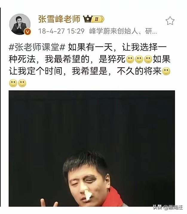 第一次在网络见到他直播时, 神采飞扬,激情四射, 富有哲理的解说, 真是让人茅塞顿开, 以后几年再见到他直播时, 虽然也是如此的讲解, 但是明显带着疲惫之态, 是睡眠不足还是心脏等亚健康的问题, 昨天就有了答案。 我不敢保证你们明年还能见到我, …… 太可怕了! 已经预感到要出事, 已经收到死亡威胁了。 这是顶着多大压力说 的这样的话。 看这样子是 预感到要出事啊。 死的蹊跷自己有预感。
