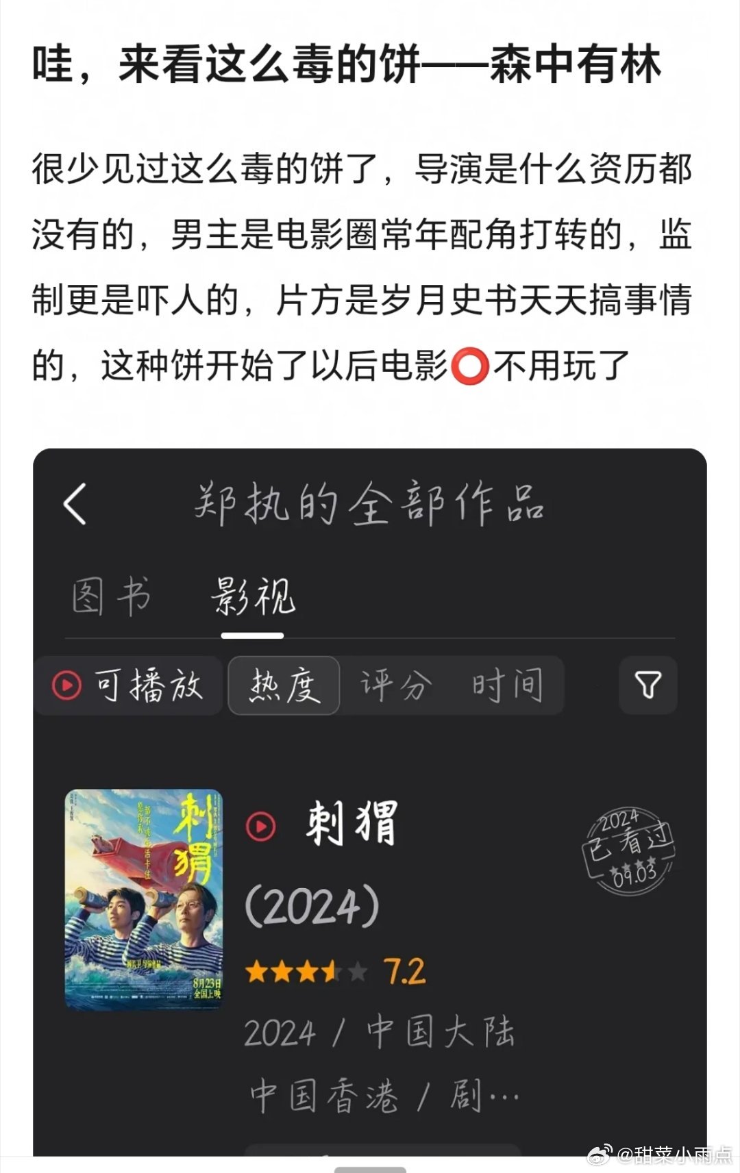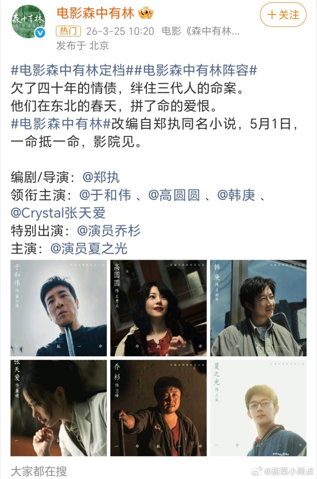 电影森中有林定档于和伟 高圆圆 韩庚主演的《森中有林》定档五一,这个饼从传的时候就有人说很少见过这么毒的饼,导演是什么资历都没有的,男主是电影圈常年配角打转的,没有一个能扛票房的。监制张一白更是吓人的,片方是岁月史书天天搞事情的,这种电影开始了以后电影O不用玩了你怎么看?