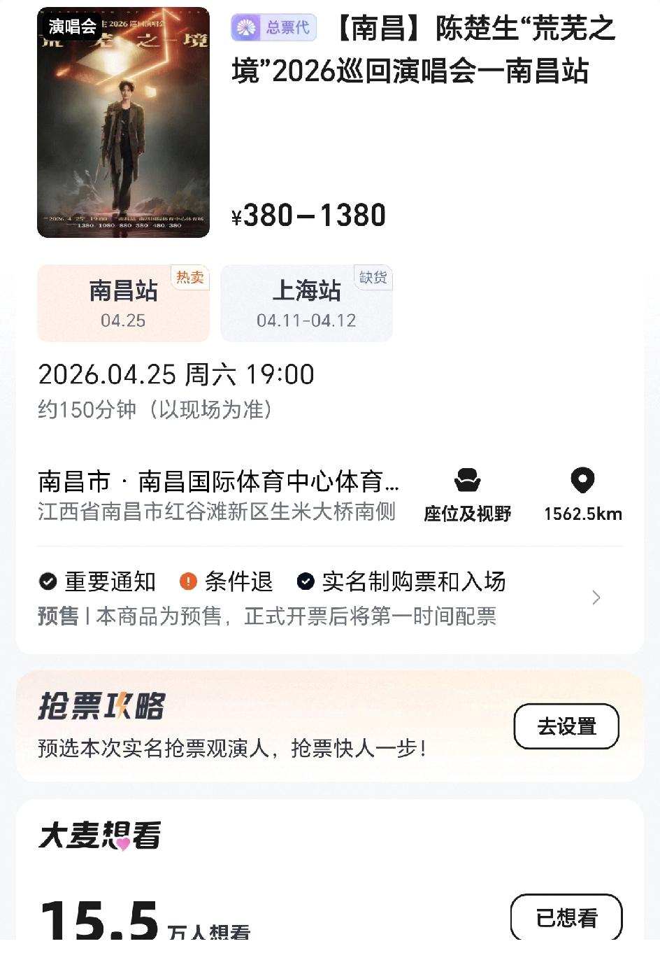 陈楚生荒芜之境演唱会南昌站竟然也售罄了,大体育场啊,几万张票,亏着我吸取了上海站的经验教训,提前定好闹钟,开票后手机好卡,我一度以为又完蛋了,还好我立场坚定,这次买到啦。 说实话这一次没有上海站那么火,我在几十秒内付了款,再退回界面看还是有票的,过了大约半小时再看就全部缺货了。 陈楚生在这个年纪在演唱会市场上还能有这样的成绩已经很值得骄傲了,大麦网,想看人数15.05万,做自己喜欢做的事情,就是人生最大的胜利! 不攀比,自然就好! 给我一个角落,安静的听就好! 还有一个小私心,我想喝瓦罐煨汤[可怜]