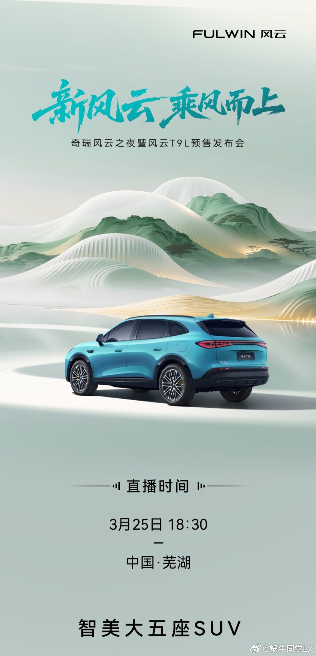 新风云,乘风而上,奇瑞风云之夜暨风云T9L预售发布会,今晚18:30开启。1月17日,风云T9L开启盲订,这款中型SUV车长4870mm,轴距2920mm,相比同级车型更大一些。搭载鲲鹏AI超能电混CDM 6.0系统,1.5T发动机最大功率115kW,配合双电机四驱,综合功率可达550kW(748马力),峰值扭矩860N·m,零百加速5秒级。纯电续航230km,综合续航2000km,还搭载了CDC自适应悬架,猎鹰700辅助驾驶。总的来说,这是一款配置均衡的SUV,家用需求完全能满足。风云T9售价为13.29 - 19.39万元,猜猜风云T9L预售的起售价是多少?老规矩,第一个猜中有奖。奇瑞风云之夜T9L正式预售