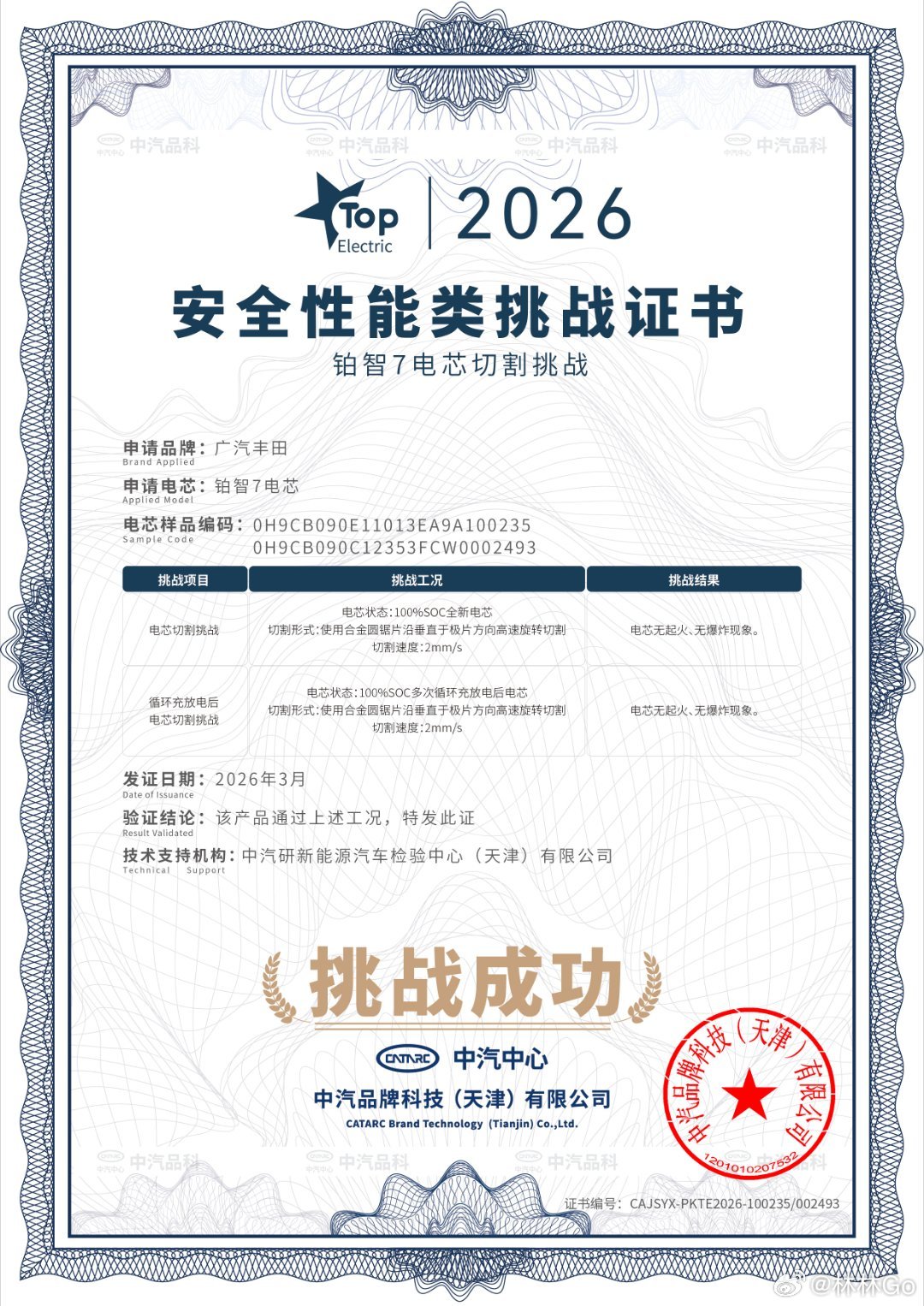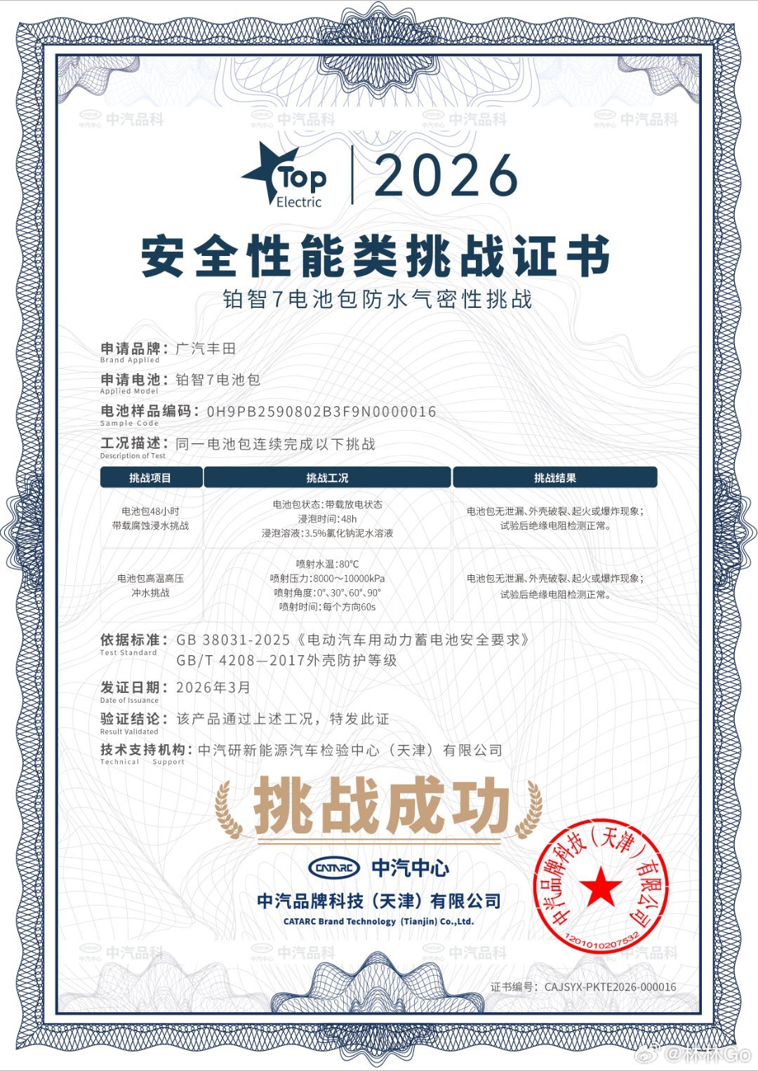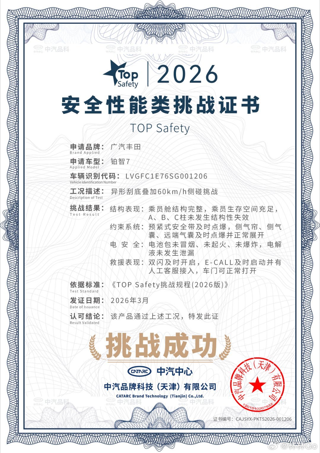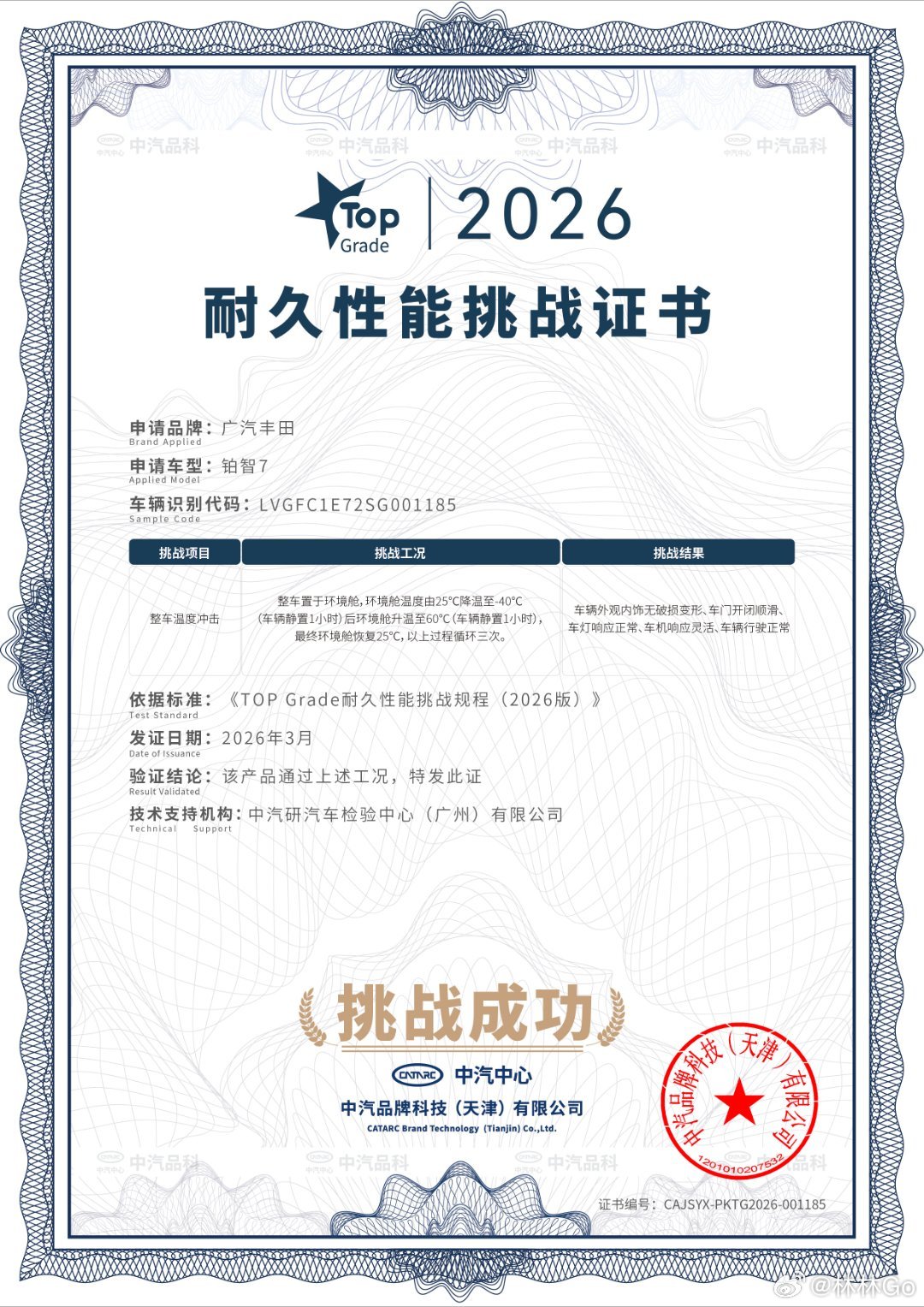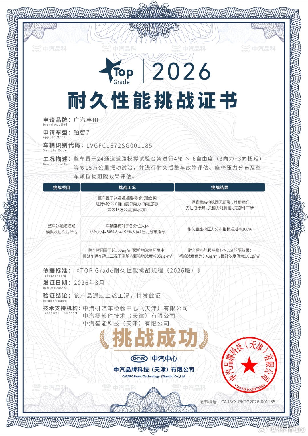 中汽中心针对丰田铂智7开展了多项极端安全耐久测试。