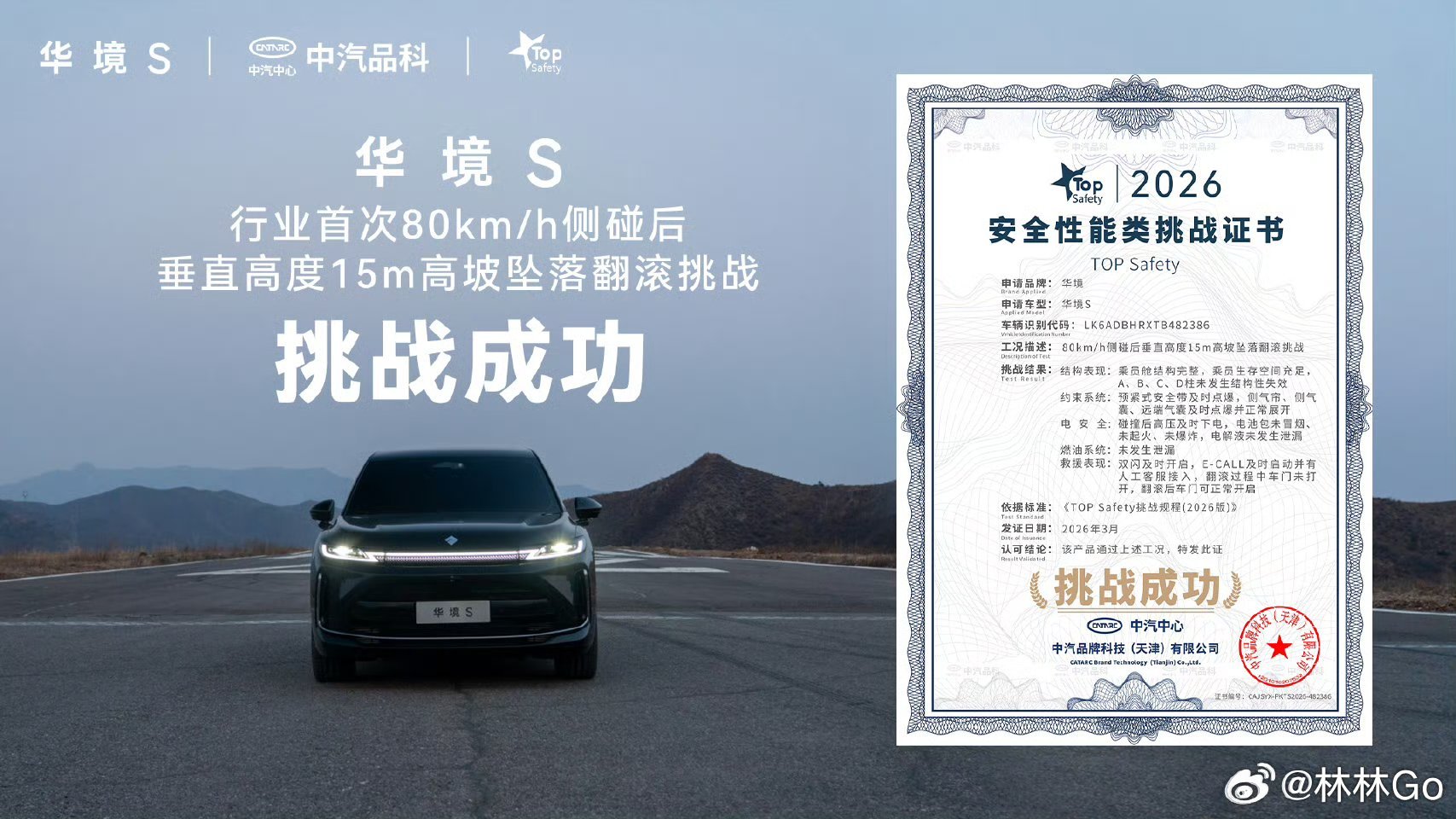 华境S全维通关超纲大考:80km/h侧碰后垂直高度15m高坡坠落翻滚极限挑战,拿下 TOP Safety 证书。从结果来看,车身结构、防护、电池等全维都很靠谱,用机械结构的绝对可靠打造安全冗余。