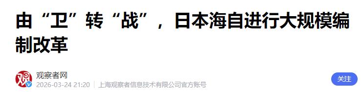 日本已经开始备战了,而且就是针对中国 3月24号,日本共同社报道称,日本海上自卫队正式实施大规模部队改编 这次改编最明显的一个变化,就是把沿用了几十年的“护航舰队”这个称呼,彻底废除了,改名叫“水上舰队”。别小看这几个字的变化,里面的门道可不小。 就在3月23号,日本海上自卫队正式废除了用了60多年的"护卫舰队"这个称呼,改叫"水上舰队"。你别小看这几个字的变化,"护卫"听着就是保护自己、防御为主的意思,而"水上"就没了这个限制,想干什么就干什么,进攻性一下子就出来了。 以前日本海自有4个"护卫队群",现在整合成了3个"水上战群"。表面上看数量减少了,但实际上每个战群的舰艇更多了,战斗力更集中了。 原来的每个护卫队群大概8艘舰艇,现在每个水上战群有12到13艘舰艇。这就像把四支小部队合并成三支大部队,虽然部队数量少了,但每支部队的实力更强了,打起来更有劲。 看看这些水上战群的旗舰配置,那更是暴露了日本的野心。第1水上战群以"出云"号为旗舰,第2水上战群以"加贺"号为旗舰,第3水上战群以"日向"号为旗舰。 这个"出云"号和"加贺"号可不是普通的驱逐舰,它们经过改装后已经能搭载F-35B隐身战斗机,说白了就是轻型航母。日本把航母当旗舰,这哪里还是什么防御性部队?分明就是进攻性的航母战斗群。 最值得警惕的是新设立的"水陆两用战机雷战群",这支部队的司令部设在长崎县的佐世保市。佐世保这个地方可不一般,它位于日本西南部,距离中国东海和台湾海峡非常近,是日本向西南方向投送兵力的桥头堡。 这支部队整合了扫雷艇和运输舰,还能和陆上自卫队的"水陆机动团"协同作战。明眼人一看就知道,这摆明了就是为夺岛作战准备的。过去扫雷部队只负责"扫雷",现在改叫"机雷战",意味着不仅能扫雷,还能"布雷",这就是典型的进攻能力。 日本共同社在报道中说得更直白,这次改编就是"着眼于中国动向、加强南西诸岛防卫力量的一环"。南西诸岛指的就是从九州向台湾方向延伸的那一串岛屿,包括钓鱼岛附近海域。日本在这里加强军事部署,针对的是谁,不言而喻。 除了海上自卫队的改编,日本还在同步进行其他军事扩张。航空自卫队要把"宇宙作战群"升级为"宇宙作战团",人员从310人增加到670人,年底还要再升级为"宇宙作战集团",达到880人规模。 到2026年底,航空自卫队还要改名为"航空宇宙自卫队"。这架势是要把战场扩展到太空去了。 日本还新设了"情报作战集团",整合情报、网络、通信等功能。按照日本自己的说法,这是为了"应对认知战",说白了就是要搞信息战、心理战。所有这些动作加在一起,日本正在构建一个从海上到太空再到网络的全方位作战体系。 为什么说日本这是在备战针对中国呢?看看他们的装备采购计划就明白了。日本已经向美国采购了"战斧"巡航导弹,射程超过1000公里,还计划采购"鱼叉"反舰导弹。这些都不是防御性武器,而是典型的进攻性武器。日本还计划在10年内将驱护舰数量增加到54艘,明显是在扩军备战。 中国社会科学院日本研究所研究员孟晓旭分析得很透彻,日本这是想借"岛屿防御"之名行突破"专守防卫"之实,是在架空和平宪法,摆脱战后体制束缚。同时日本还要全面对接美日同盟,深度嵌入美国的印太战略,充当美国在亚太的前沿抓手和军事支点。 日本自卫队前航空自卫队员、军事评论家小西诚说得更直接,这次改编显示出日本政府打算将海上自卫队"实战化"的意图。日本法政大学政治学教授白鸟浩也警告说,这与和平主义相违背,通过强化自卫队并在九州新设部队,设立司令部,这显然不能说与"台湾有事"毫无关系。 说白了,日本这次海上自卫队的大改编,就是从里到外、从名称到实质的一次全面转型。过去日本海自的主要任务是保护自己的海上交通线,是防御性的;现在他们要变成能主动出击、能夺岛登陆、能远程打击的进攻性力量。而且这一切都是在"中国威胁"的幌子下进行的,日本共同社自己都承认是针对中国。 从"护航"到"水上",从"防御"到"进攻",从"自卫"到"作战",日本正在一步步突破战后和平宪法的限制,把军事力量正常化。这次改编只是冰山一角,背后是日本整个国家战略的转向。