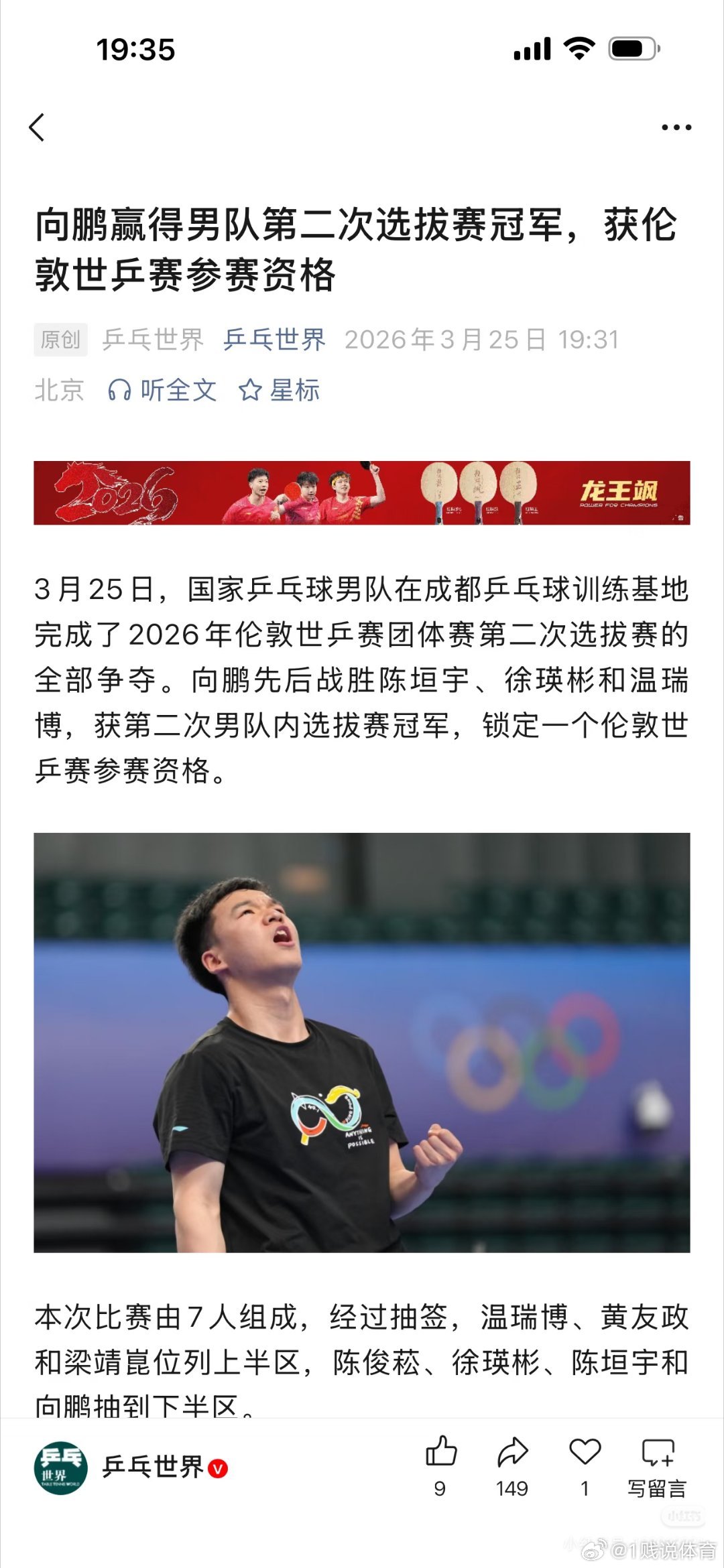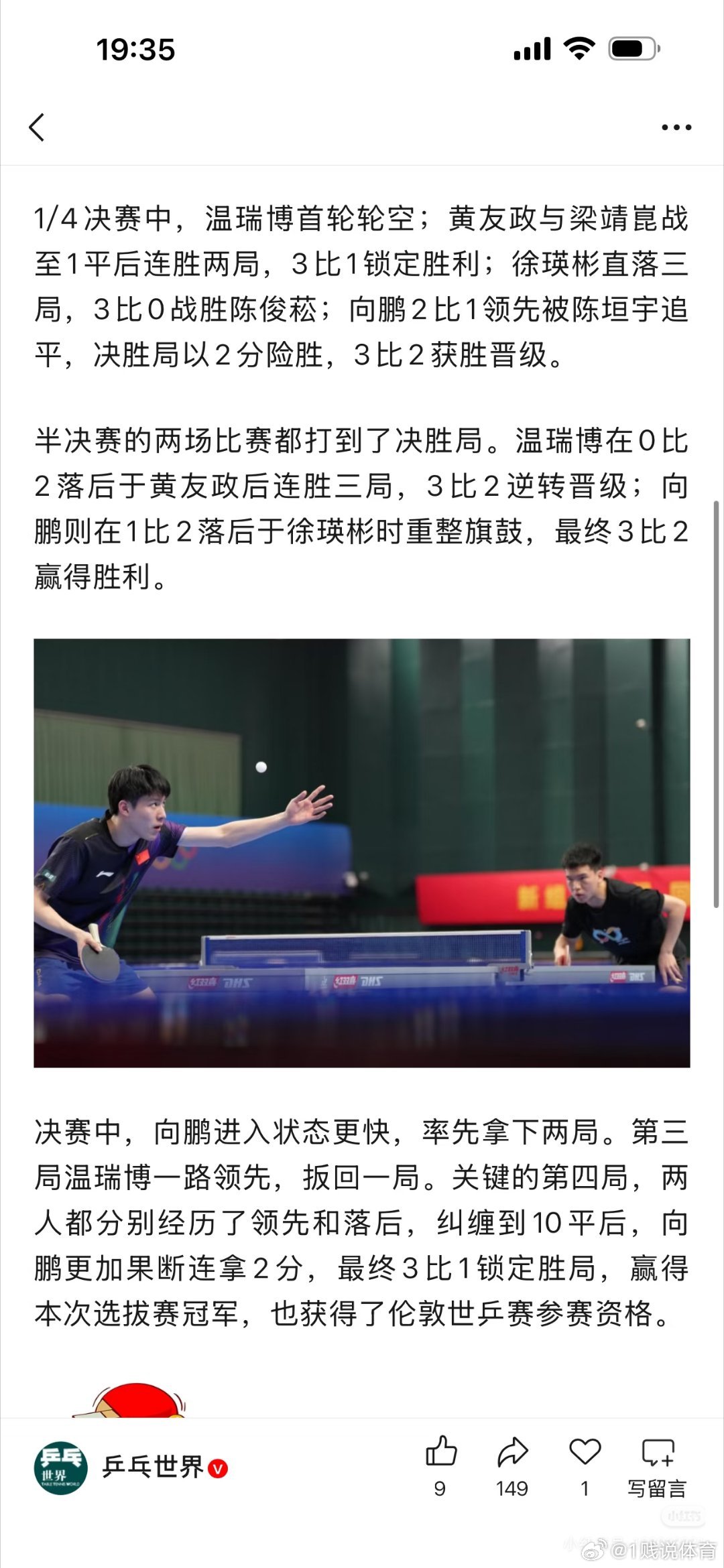向鹏赢得男队第二次选拔赛冠军澳门世界杯没有向鹏,伦敦世乒赛选上了,还是多多锻炼,温瑞博,陈垣宇,徐瑛彬,不是对手,目前确认的有王楚钦,林诗栋,周启豪,向鹏,就差最后一位了,樊振东呢他会去吗?向鹏获伦敦世乒赛参赛资格