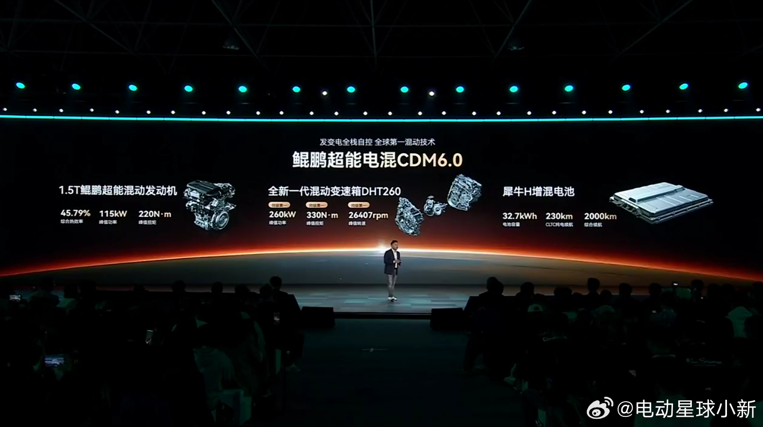 动力上,搭载了 鲲鹏超能混动 C-DM 6.0,1.5T 发动机+全新一代混动变速箱 DHT260,CLTC 纯电续航有 230km,综合续航去到了 2000km,馈电油耗 3.9L/100km。