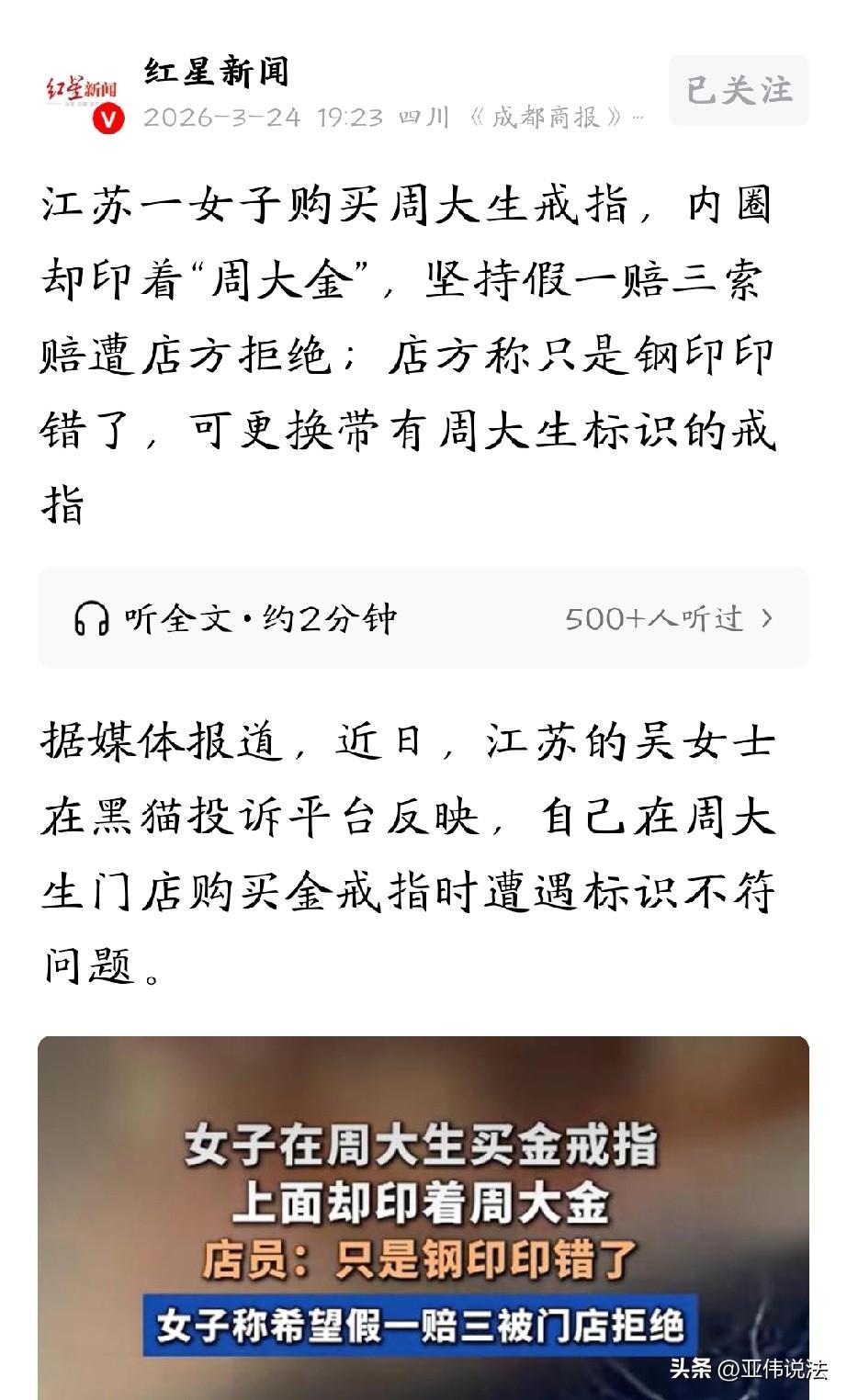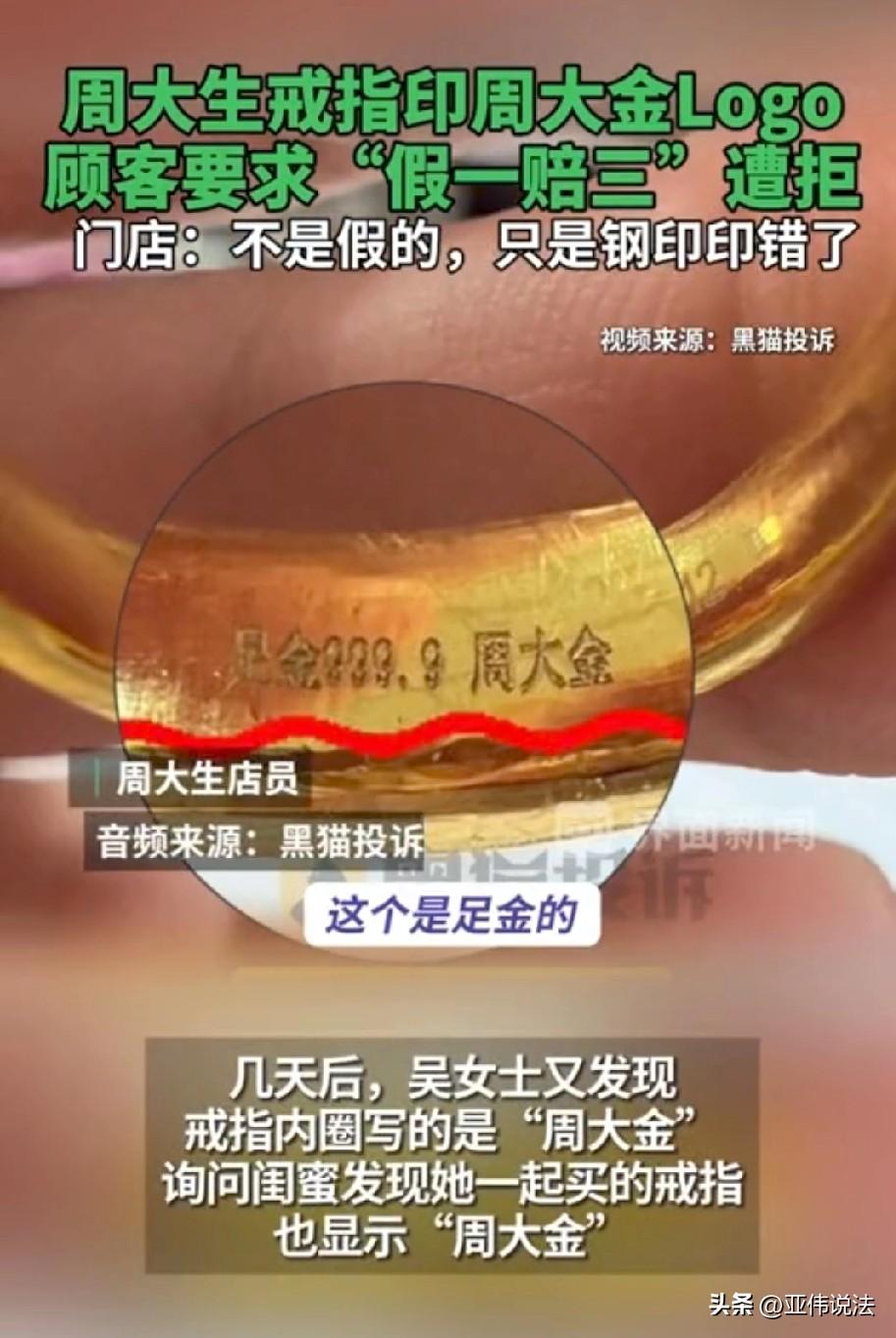 江苏泰州,女子和朋友到周大生门店买了一款金戒指,结果拿回家一看,发现内圈上却印着“周大金”。很明显,自己买到了冒牌货,女子很生气,找到门店要求三倍赔偿。谁知,门店表示,金子是真的,只是钢印印错了,可以给他换成带有周大生标识的。这敷衍的态度让女子无法接受。 2026年2月21日,吴女士拉着朋友一起去逛商场,路过一家金店时,她两就走进去,想挑个戒指。 在店里,她左挑右选,终于看中了一款,虽然金价很高,奈何她喜欢的不得了,当时就咬咬牙买了下来。 她满心欢喜的回到家一试,结果发现戒指圈口有点大,第二天她就又回到店里,想要换个小一点的。 第二次去店里的时候,朋友也看中了同款戒指。可店员说,店里现在没有合适圈口的,不过能从总部调货。 吴女士和朋友也没多想,就等着调货。 2月27日,调来的戒指送到了,吴女士拿到手,先看了看质保单,发现上面没标注克重,金额也好像有点不对,而且还没有吊牌。 不过,当时店员现场给她复称了克重,她想着反正克重是对的,吊牌的事儿也没太往心里去。 可过了几天,吴女士闲着没事,仔细端详戒指的时候,突然发现戒指内圈刻着“周大金”三个字。 她心里忽然一紧,赶紧问朋友,朋友一看自己的戒指,钢印居然也是“周大金”。 吴女士一下子就火了,自己可是花了周大生的品牌价买的戒指,结果内圈刻的是“周大金”,这不明摆着是买了个冒牌货嘛。 钢印虽一字之差,但价值差之千里。 这可不是买个萝卜白菜,随便凑合凑合就行的,是价值不菲的金戒指,于是,她气冲冲地拿着戒指回到店里,找店员讨要说法。 根据吴女士提供的聊天记录和录音,店员承认这是他们工作失误,还一个劲儿地解释,说货品是足金材质,绝对不是假货,就是钢印印错了。 店方还提出,可以给吴女士换一枚带有周大生标识的戒指。 这个解释让吴女士无法接受,她觉得,就算黄金是真的,可钢印不对,那就不属于正品。 自己是以品牌的价格买的,结果买到个非品牌产品,这谁能咽得下这口气? 她态度坚决地要求门店按照“假一赔三”的标准进行赔偿。 但门店明确拒绝了她的这个诉求,这可把吴女士气坏了。 《消费者权益保护法》第五十五条规定:经营者提供商品或者服务有欺诈行为的,应当按照消费者的要求增加赔偿其受到的损失,增加赔偿的金额为消费者购买商品的价款或者接受服务的费用的三倍;增加赔偿的金额不足五百元的,为五百元。 门店以周大生品牌名义销售、收取品牌溢价,实际交付钢印为“周大金”的非约定品牌商品。 即便黄金材质为真,仍属于故意隐瞒商品真实信息、误导消费者的消费欺诈,同时侵犯消费者知情权与公平交易权。 吴女士按价款主张“假一赔三”,符合法律规定。