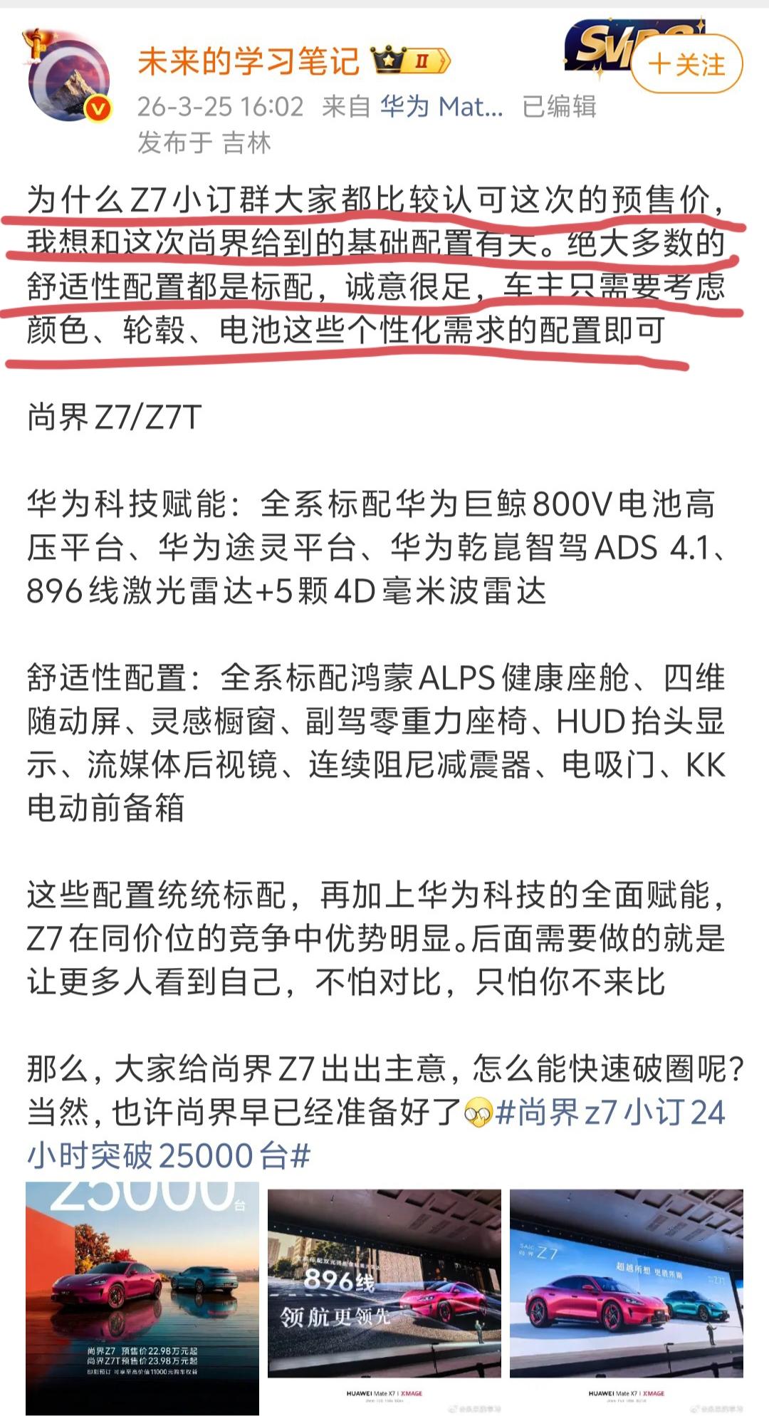 博主“未来的学习笔记”爆料,现在有一批人专门盯着尚界Z7和问界M6造谣拉高预期,甚至还有人跑到直播间放出“Z7智驾包免费送了”的烟雾弹,他们的目的就是把水搅混,给鸿蒙智行制造压力。 不过,“未来的学习笔记”也带来了一个好消息,他说尚界Z7小订群里,大家都很认可预售价,认为绝大多数的舒适性配置都是标配,诚意很足。 这些人也真是的,先是一边笑尚界Z7“怎么荣耀怎么来”,发现不仅没有用,反而把尚界双7的热度抬上去了,给鸿蒙智行白白送流量,现在又换个套路,玩起推高预期这招数了,这是没招儿了吗? 说实在的,这样做的对手一点都不聪明。从尚界Z7小订群的反馈和订单情况来看,这招其实已经失效了。毕竟,想买车的人不会去评论区看你们怎么带节奏的,大家认可的是实打实的配置诚意,而且也会亲自试驾体验。鸿蒙智行的车,从来不怕车主货比三家。华为入局智驾的鲶鱼效应鸿蒙智行 上汽集团 尚界 尚界Z7 尚界Z7T