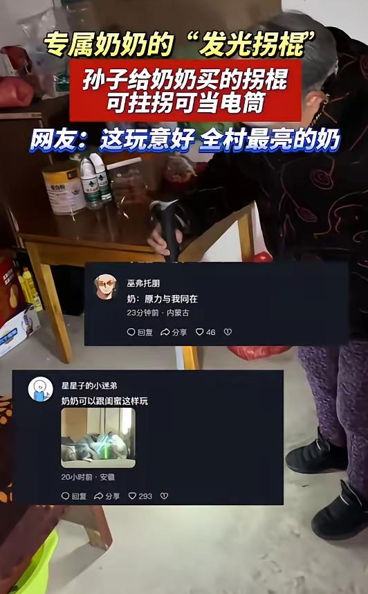 3月7日,安徽,一老人腿脚不利索,晚上出门总怕绊着,她随口和孙子说了这件事后,孙子随即给老人买了根“发光拐棍”,不仅能辅助老人行走,还自带照明功能,如今老人逢人就举着拐棍炫耀!网友:全村最亮的奶! 事件的主人公是一位腿脚不便的老人,随着年纪增长,她的行动愈发迟缓,双腿无力,平日里只能依靠普通拐棍勉强行走,尤其到了夜晚,天色渐暗,视线模糊,路面的坑洼、台阶都变得难以分辨。 每次晚上出门,她都格外小心翼翼,生怕脚下一滑被绊倒,这份顾虑,只是她平日里和孙子闲聊时随口提起的一句话,未曾想,却被孙子牢牢记在了心里。 老人从未想过要让孙子为自己特意做些什么,那句关于晚上出门怕绊着的话,更像是一句无心的感慨,说完便抛在了脑后,只当是缓解内心的小顾虑。 可在孙子看来老人的每一句随口提及,都是需要被放在心上的需求,他清楚地知道,老人腿脚不便,视力也随着年纪增长有所下降,夜晚出门的恐惧,不是一句安慰就能化解的,唯有真正解决问题,才能让老人安心。 于是孙子没有丝毫犹豫,当即开始挑选适合老人的拐棍,对比了多款产品后,最终选定了一根自带照明功能的“发光拐棍”,既能够满足老人辅助行走的基本需求,又能在夜晚照亮脚下的路,彻底解决老人的顾虑。 没过几天发光拐棍就送到了老人手中,这根拐棍比普通拐棍更轻便,握感舒适,专为老人设计,不用费很大力气就能握住,最贴心的是它的照明功能,只需轻轻一按按钮,柔和的暖黄色灯光就会亮起,清晰照亮脚下两米范围内的路面,既不刺眼,又能有效避开障碍物。 起初老人还念叨着孙子浪费钱,觉得自己凑合用普通拐棍就好,可当她真正拄着发光拐棍在夜晚走出家门,感受到脚下被灯光照亮的踏实感,脸上的顾虑渐渐消散,取而代之的是藏不住的欢喜。 如今这根发光拐棍成了老人的“宝贝”,每天吃完晚饭,天刚擦黑,她就会拄着拐棍出门溜达,再也不用像以前那样畏首畏尾。 不管是遇到同村的邻居,还是路上的熟人,老人都会主动举起手中的发光拐棍,一脸骄傲地展示,那份藏在眼底的喜悦,感染着身边的每一个人,邻居们看到后,无不羡慕老人有这样贴心的孙子,纷纷夸赞这根拐棍实用又暖心。 这件事被邻居拍下片段传到网络后,迅速引发了网友们的热议,大家被这份朴素的孝心打动,纷纷留言调侃,称这位老人是“全村最亮的奶”。 还有网友表示真正的孝顺从不是昂贵的礼物,而是把长辈的随口一句话放在心上,用行动解决他们的烦恼,一根小小的发光拐棍,照亮的不仅是老人夜晚出行的路,更承载着孙子对老人满满的关爱与牵挂。