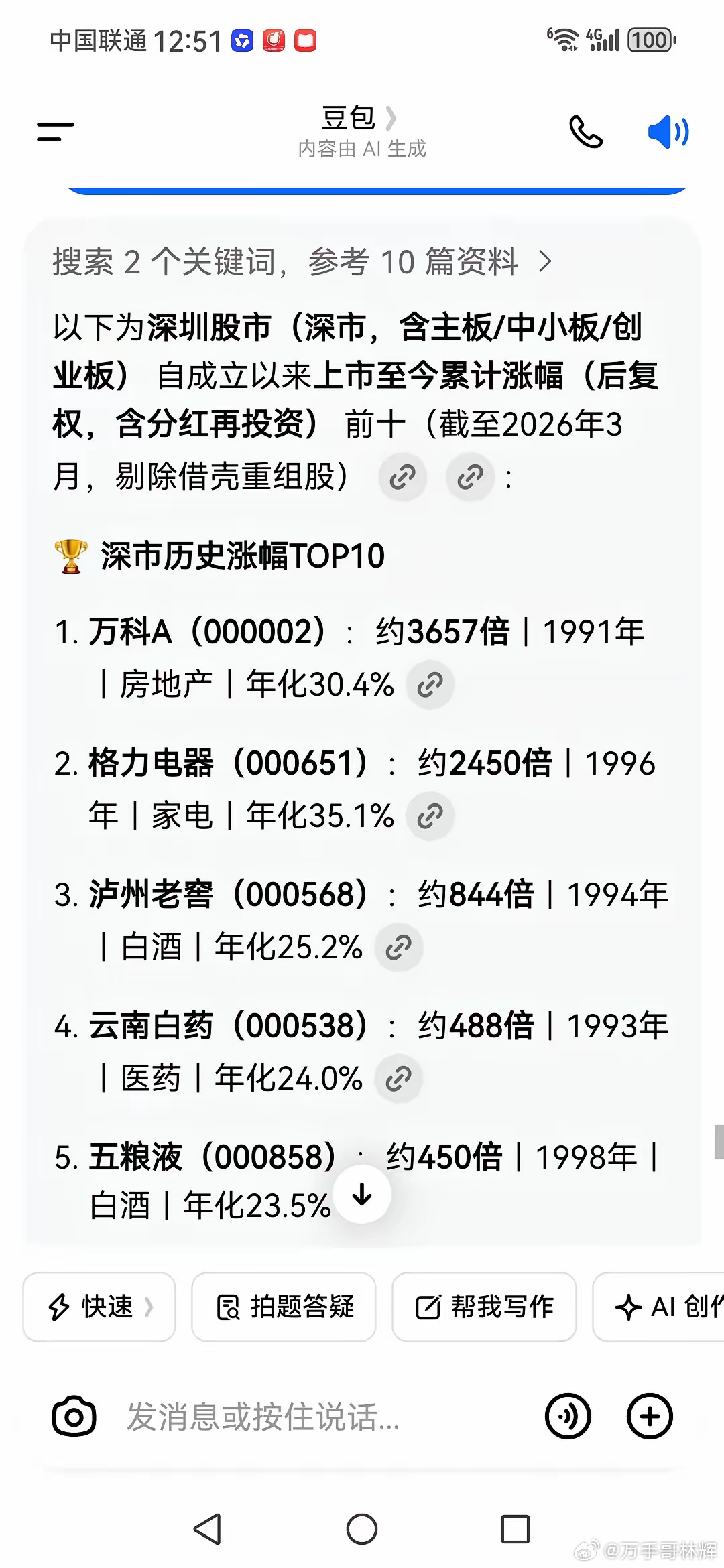 银行股涨的慢?自A股成立以来,历史上上市最早的银行是平安银行,上市时叫深圳发展银行,简称深发展。1991年上市,上市至今(35年)累计涨幅约40倍,包含分红再投资在内。这在深圳市场属于涨幅比较大的。深圳市场自上市以来涨幅最大的股票比它涨幅大很多,大家不会想到的是即使万科最近几年跌幅很大,但它是股市成立以来涨幅最大的股票,自1991年上市至今(35年)涨了3657倍,是平安银行涨幅的约90倍。所以长期投资选股比选时更重要,如果是上市时买入的万科,你持有到现在,卖出时机没把握好,在万科跌了几年后卖出它,也能是股市中赚的最多的人。见下面截图深圳市场自上市以来上市公司涨幅最大的5只股票中,一只房地产股,一只家电股,两只白酒股和一只医药股涨幅都比平安银行涨幅大很多倍。不能由这个就得出银行股涨的慢的结论。实际上平安银行的涨幅超过了90%以上的上市公司涨幅的。注意!以上是历史表现,不能代表未来。我们只可以参考,不能作为对未来的投资依据!