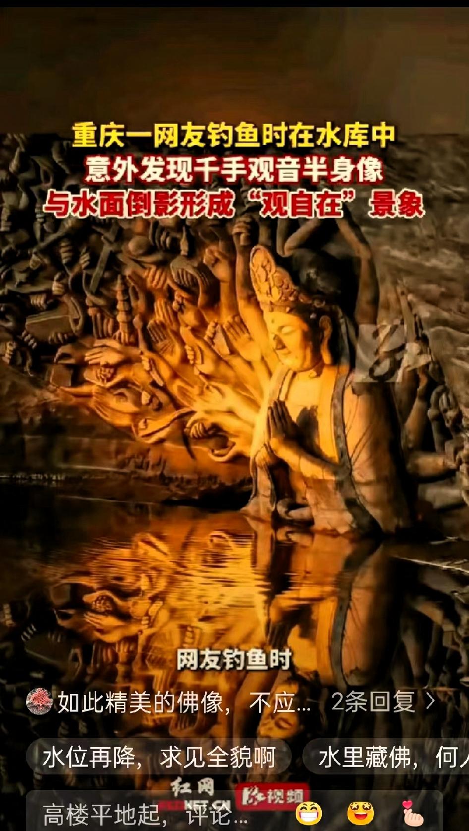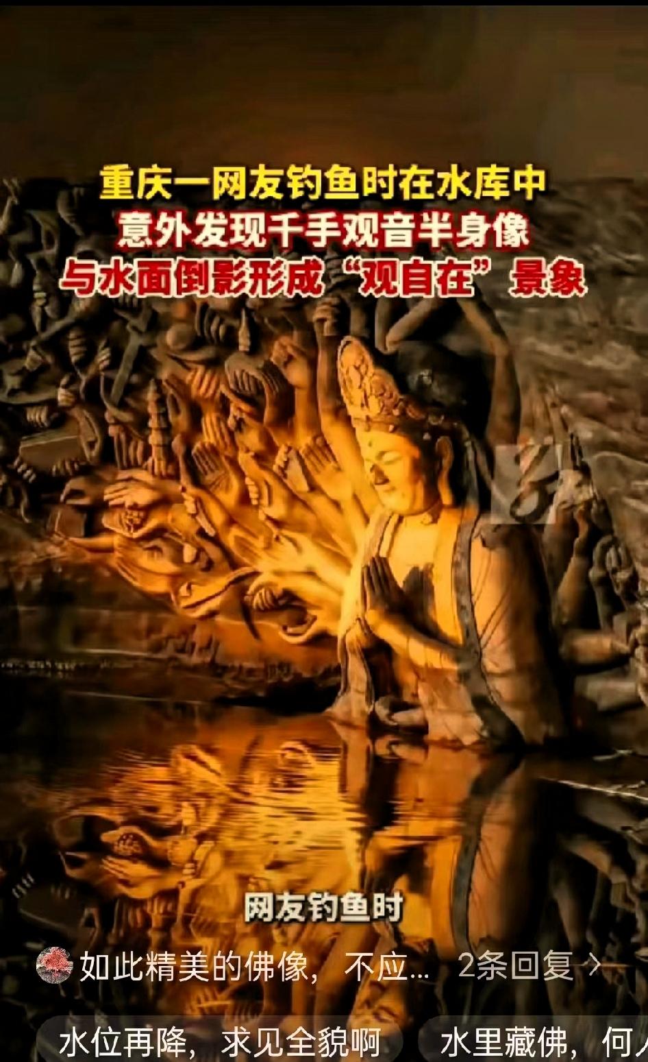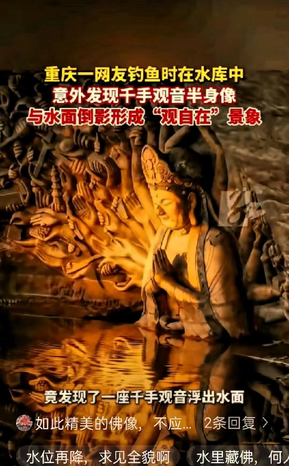 太震撼了,重庆,一男子在水库钓鱼时,无意间看到远处水面上有个奇怪的雕像,他立马用无人机飞过去拍,发现是一尊半身出水的千手观音石像。 石像一半露出水面,一半映在水中,姿态端庄,画面宁静而庄严,形成难得一见的自然与人文相融的景象。 据当地居民介绍,这尊石像长期被水淹没,只有在水位下降到特定高度时才会显露半身,一年之中仅能见到两三次,属于非常偶然才能看到的景观。石像虽经湖水常年浸泡,但整体保存较好,线条清晰,透着古朴的质感,也承载着当地的历史记忆。 西南地区不少水库、古河道中,都曾因历史原因沉入一些造像与建筑构件。它们被水覆盖后,反而减少了风化与人为损坏,成为水下留存的文化痕迹。这次观音像的出现,不仅是一次视觉上的偶遇,也让更多人注意到水下藏着的历史印记。 此事传开后,不少人表示被这份宁静的美打动,认为这样的遇见是一种缘分。有人说,生活里的小惊喜往往不期而遇,平凡的一天也可能撞见特别的风景。