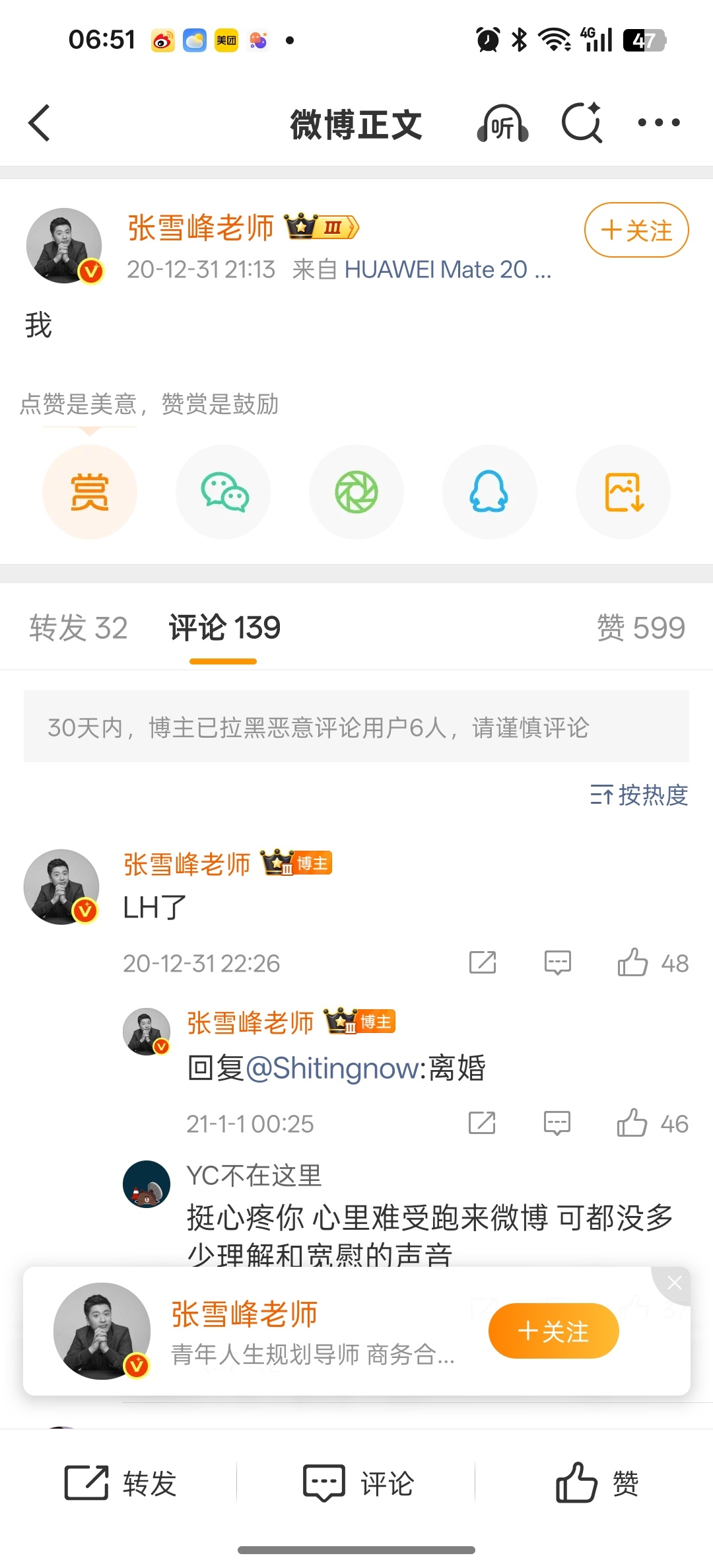考证了一下,张确实有二次婚姻,微博自己公开过。只不过不知道是女方前妻和他离婚的还是怎样。人已经走了,我们就不要往负面揣测了。