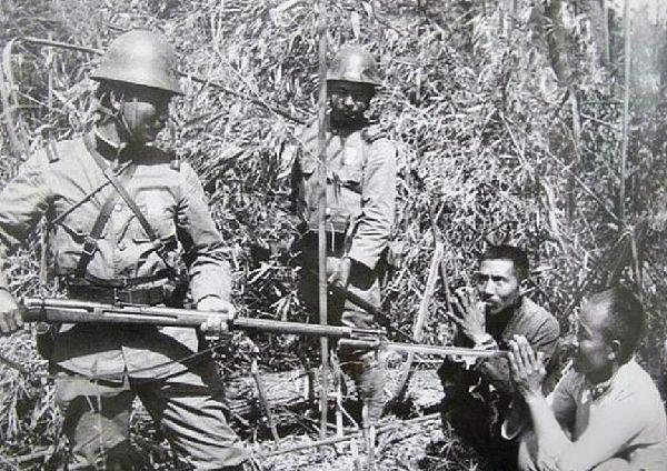 这张照片是侵华日军在华暴行的直接罪证,记录了抗日战争期间,日军士兵用刺刀胁迫中国平民的恐怖瞬间。 两名日军士兵头戴日式钢盔,身着标准军装,手持上了刺刀的**三八式步枪(三八大盖)**。左侧士兵将刺刀直接抵向平民,姿态凶狠,是典型的恐吓与施暴姿态。 两名中国平民蹲坐在地上,双手举起,面露惊恐与绝望,这是面对日军刺刀时本能的求生反应。 这张照片出自日军随军摄影师,是日军自己记录下的罪行。在侵华战争期间,日军常以“清乡”“扫荡”为名,对中国平民进行恐吓、屠杀与掠夺,这类用刺刀胁迫平民的场景,是无数暴行中的一个缩影。