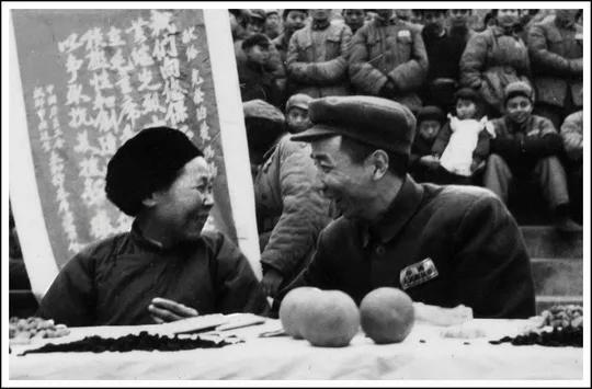 1953年2月,抗美援朝特级英雄黄继光的母亲邓芳芝,受邀到部队作报告的瞬间 左侧的邓芳芝身着朴素中式布衣、头戴黑布帽,脸上带着温和慈祥的笑容,正与身旁的部队干部亲切交谈,后面挤满了身着军装的部队官兵,他们神情专注,静静聆听英雄母亲的讲述;邓芳芝的到来,让官兵们近距离感受到英雄背后的家庭力量,也让黄继光的精神从战场延伸到军营,扎根在每一位战士心中。