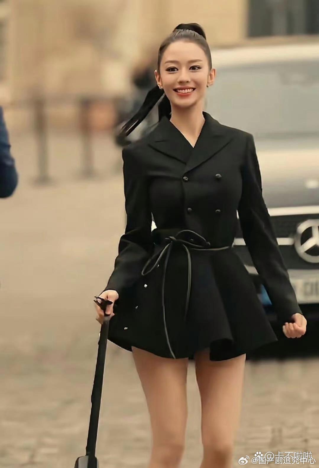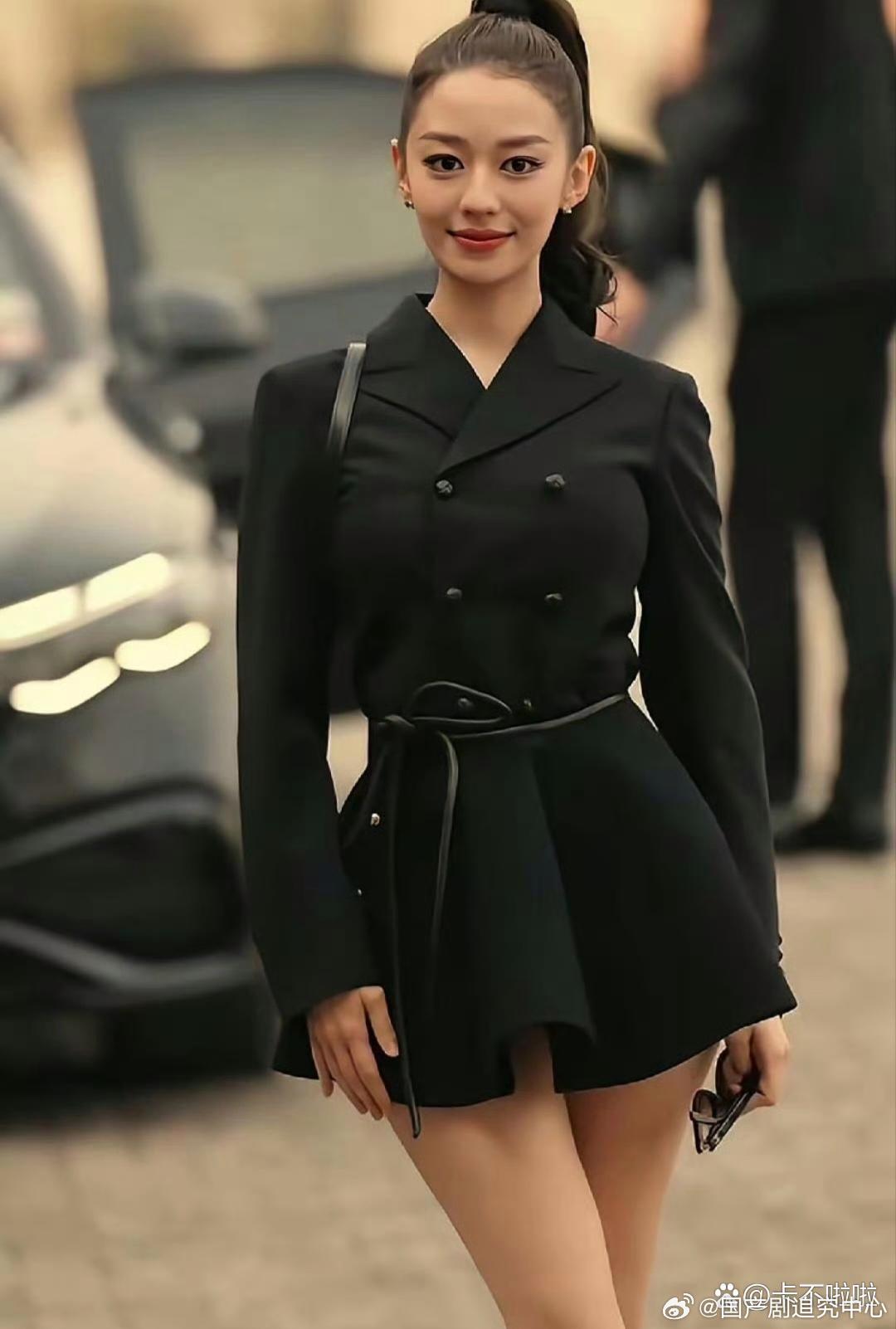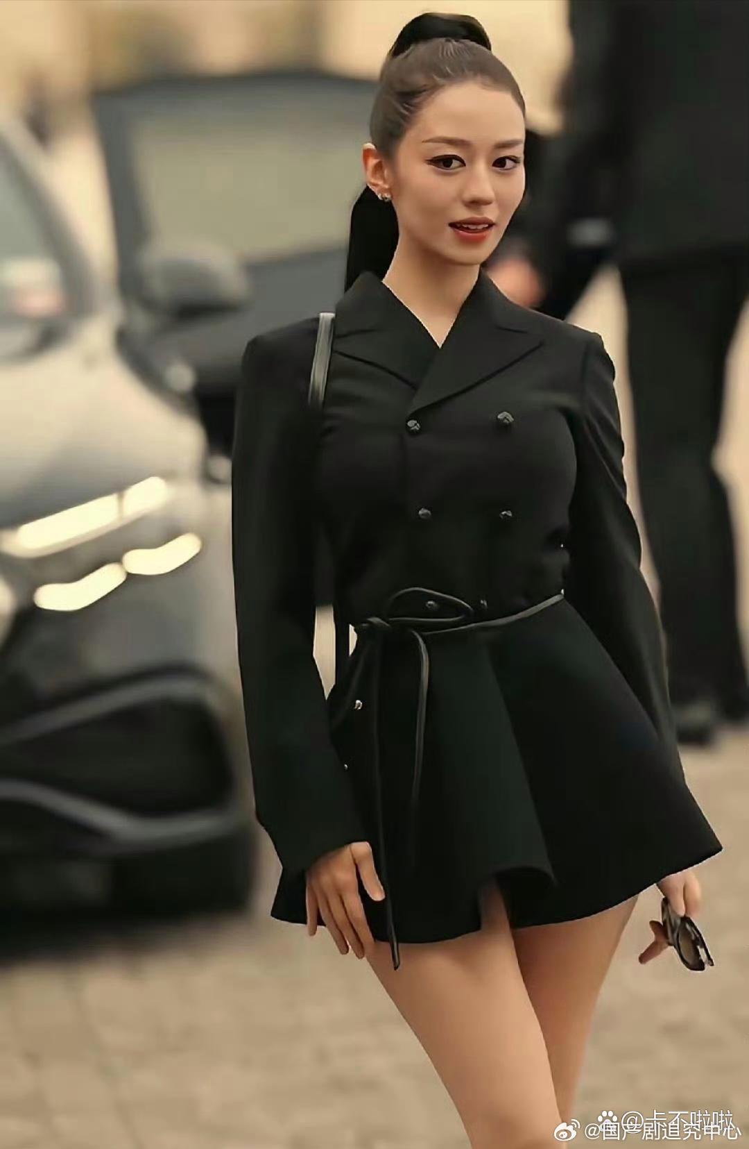 吉娜这一身也太敢了!高马尾配收腰西装短裙,蚂蚁腰大长腿直接拉满,又辣又飒。