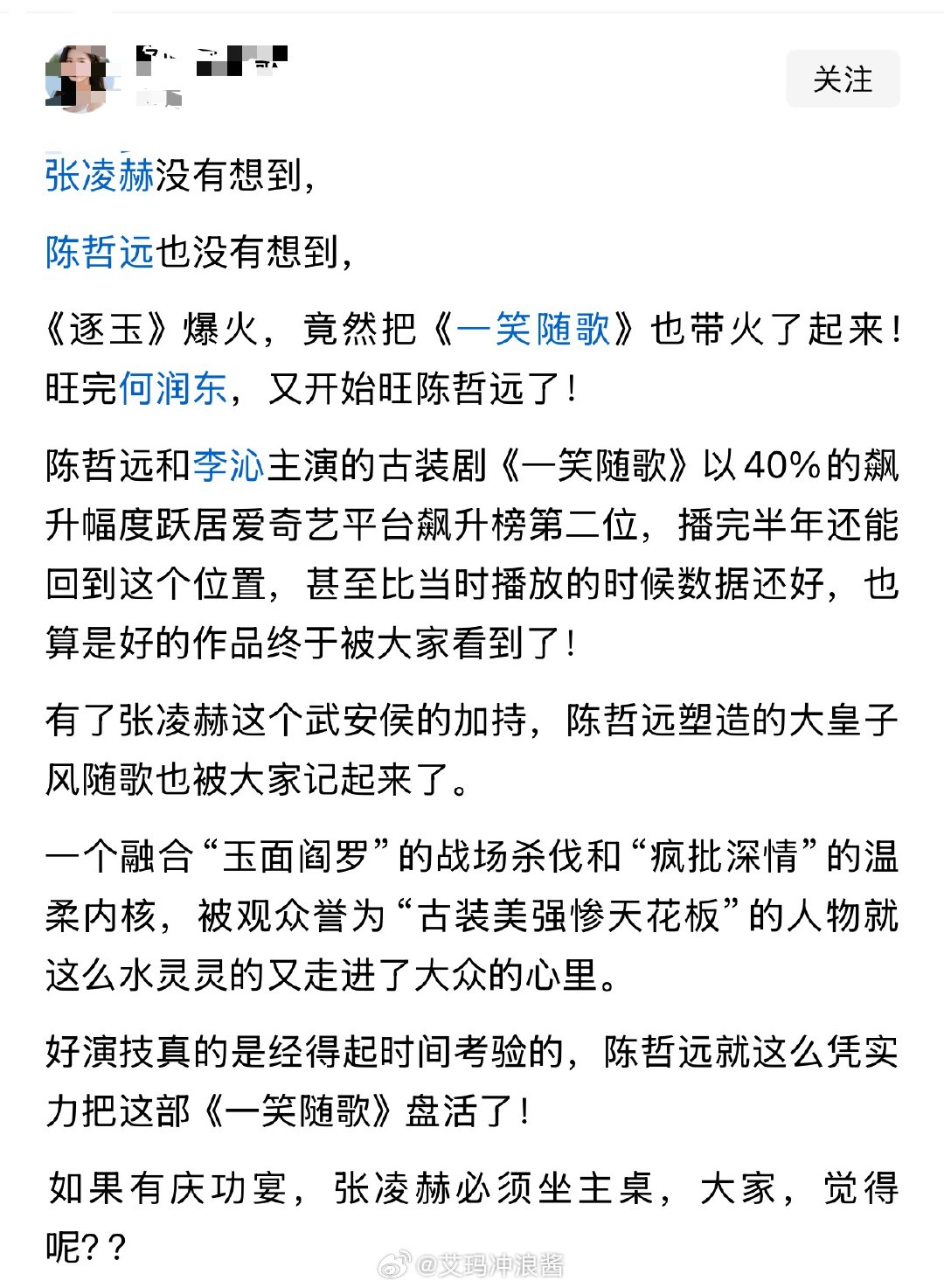 张凌赫没有想到,陈哲远也没有想到,《逐玉》爆火,竟然把《一笑随歌》也带火了起来!旺完何润东,又开始旺陈哲远了!