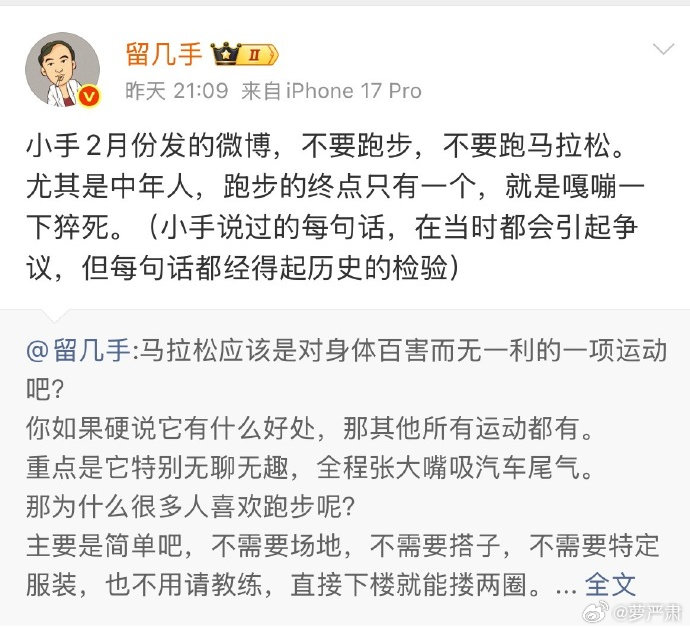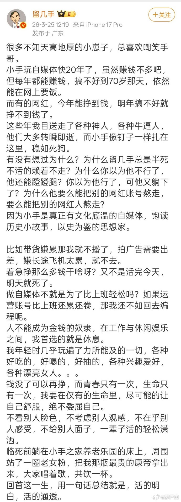 留几手在张雪峰去世后发布争议微博,现在被禁止关注。