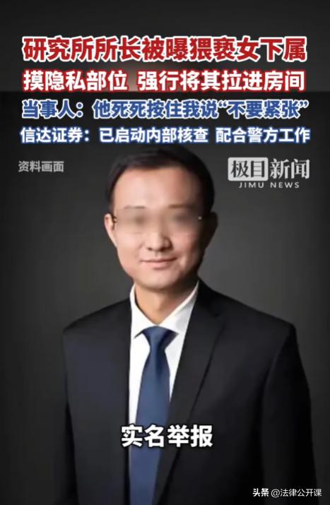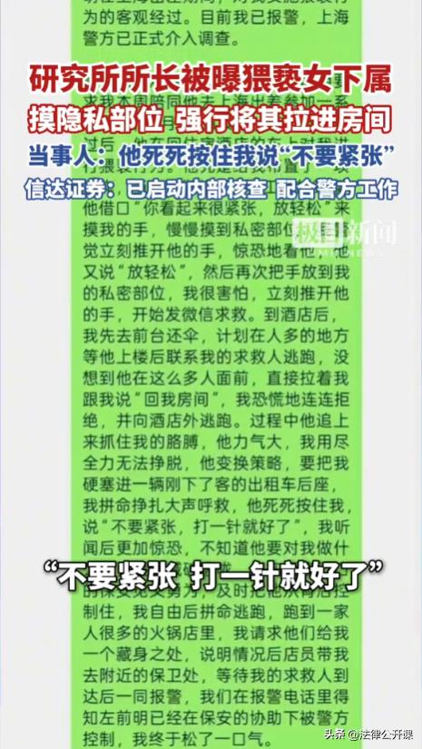 上海,一女子陪同所长出差,却遭到所长的猥亵。回到酒店后,女子想要逃离,却被所长当众拽住手腕打算将其强行拖去酒店房间。女子奋力挣脱后刚跑到酒店门口,就被所长拽上了一辆出租车,还被所长压在后座威胁:“不要紧张,打一针就好了!”女子被吓坏了,好在酒店保安及时出现施救,女子才得以逃脱。后女子躲在一家火锅店报了警。目前,该所长已被刑拘,一切工作也被暂停。 据悉,唐女士毕业后就入职了这家证券研究所,目前已经工作3年。 唐女士对所长左某的印象一直都很好,因为左某非常有能力,为人也很和善,对待同事都很友好。唐女士十分敬重左某。 3月中旬,唐女士突然接到左某得通知,要求她陪同去上海参加一系列的会议,为期一周左右。唐女士当时十分高兴,也十分珍惜这个机会。 可谁曾想,在3月24号晚上,唐女士陪同左某参加完一场饭局后,左某的另一面彻底暴露了,让唐女士感到无比陌生与害怕。 当时二人正在回酒店的车上,左某突然给唐女士安排了一个工作。唐女士没有任何犹豫,立即按照要求开始工作。 就在唐女士沉浸式工作时,左某突然伸手摸向唐女士的隐私部位。唐女士反应过来后,立即抬手阻拦,并带着不可思议的眼神看着左某。 万万没想到,左某被阻拦后并没有退缩,而是再次伸手摸向唐女士的隐私部位。唐女士也再次阻拦,并出声制止。 也许是担心被司机听到,左某未再继续。但接下来的时间对唐女士来说简直就是煎熬,她开始担心等下到酒店该怎么办? 等二人到达酒店后,唐女士先下车去归还向酒店借的伞,然后打算先回酒店房间躲起来,可左某却突然出现在身后,并当着酒店众人的面强行拖拽唐女士,试图将其拽回房间。 唐女士当时被吓坏了,大声向酒店工作人员求救,同时奋力挣脱了左某的手,然后向酒店外面逃去。 左某立即追了上去,当时一辆出租车停在酒店门口下客,左某追上唐女士后,将其按倒在出租车后排座位上,然后在唐女士耳边轻声说了一句:“不要紧张,打一针就行!” 唐女士听到后更紧张了,左某竟然在大庭广众之下想要发生关系,可左某力气太大,唐女士根本反抗不了。 就在这时,出租车司机出言阻止,酒店的保安随即出手从左某身后将其控制了起来。唐女士见状立即下车往外逃去,在路过一家火锅店时,唐女士请求店员能给她提供一个安全场所。 店员见唐女士十分慌张,立即给唐女士安排了一个安全的位置,随后唐女士报了警。 警方没几分钟就赶到了现场,在了解情况后将左某和唐女士等人带回了派出所接受调查。 根据唐女士的供述以及证人证言,警方确认左某的行为已经涉嫌犯罪。 后唐女士实名举报了左某的行为,研究所对此十分重视,明确表示已暂停左某的一切工作,并积极配合警方调查。 看到唐女士的遭遇,让我们不禁想起崔女士的遭遇,同样是遭到老板的侵犯,但唐女士比较幸运,她没有喝醉,且还有酒店保安等人的帮助,使她逃脱了左某的魔爪。 按照唐女士对左某一开始的描述,到现在左某对唐女士实施的行为来看,真的是知人知面不知心。没想到如此有才华有涵养的人,会做出如此恶劣的行为,他难道认为自己有权有钱,就能左右所有女性了? 有人对警方刑事立案的行为表示不解,左某虽然不对,但好像也没有发生什么,为什么会构成犯罪? 在本次事件中,左某一共对唐女士实施了两项违法行为。第一个是猥亵,第二个是强 奸。 从唐女士的描述来看,在回酒店途中,左某两次触摸了唐女士的意思部位,这可以确定左某对唐女士实施了猥亵。 但左某实施的这两次猥亵行为中,并没有出现暴力、胁迫等行为。也就是说,左某的两次猥亵行为,可能并不构成强制猥亵罪。 《治安管理处罚法》第52条规定,猥亵他人的,处5日以上10日以下拘留;猥亵精神病人、智力残疾人、不满14周岁的人或者有其他严重情节的,处10日以上15日以下拘留。 因此,从猥亵行角度来看,左某可能将面临行政处罚。 可是警方已经对左某采取了刑事强制措施,这说明左某的行为已经涉嫌犯罪。 既然左某的猥亵行为不构成犯罪,那左某的什么行为构成犯罪呢? 从唐女士的供述来看,左某在将唐女士按在出租车后排后,在其耳边说要给她打一针。 如果光从字面意思理解,这的确没什么。但“打一针”可不仅仅是医学术语,它在恋人或夫妻之间,也经常会出现,意思是指发生关系。 也就是说,当左某对唐女士说出要给她打一针的时候,就代表左某想要和唐女士发生关系。 而且左某当时还压着唐女士,这说明他已经开始了行动,只是后来被酒店保安给制止了,没有得逞,这属于超出意志以外的因素,符合犯罪未遂的条件。 因此,左某的行为涉嫌强 奸罪未遂。 那接下来就等着检察院如何认定,以及法院如何判决了。一旦左某被定罪处罚,那他的职业生涯就告终了,研究所必然会解除与左某的聘用关系。 此外,作为受害者的唐女士,其不仅可以向左某索赔,还可以申请工伤认定。 大家对此怎么看?