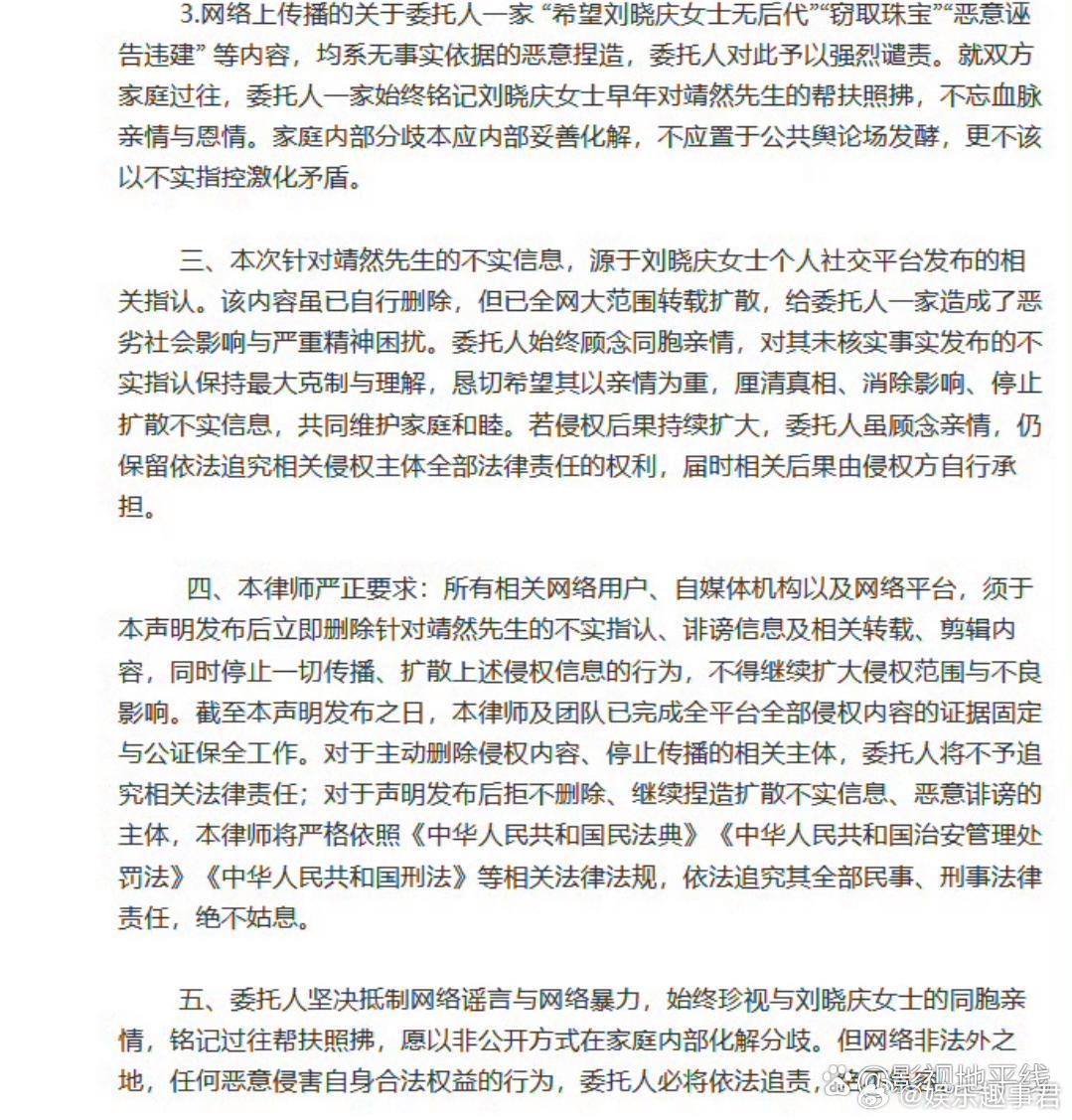 26日,刘晓庆妹妹及外甥委托律师发声明,否认发布刘晓庆去世相关消息,“从未参与任何涉案谣言的编造与传播”。此外,网络上传播的 “希望刘晓庆女士无后代”“窃取珠宝”“恶意诬告违建” 等内容,均系无事实依据的恶意捏造。