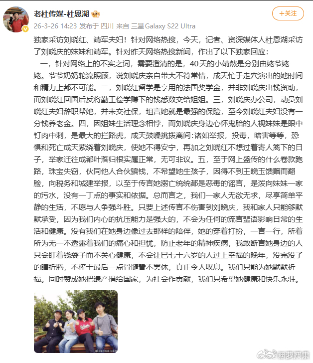 传媒人杜恩湖则发布刘晓庆妹妹刘晓红的回应。(图5,原微博现已删除。)