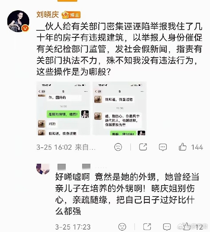刘晓庆被造谣去世后亲自辟谣(图1),并晒出聊天记录表示造谣的人就是自己的外甥靖然(图2)。同时也透露有人诬陷她住了几十年的房子是违建,“以举报人身份催促有关纪检部门监督,发社会假新闻,指责有关部门执法不力,殊不知我没有违法行为,这些操作是为哪般?”(图3)
