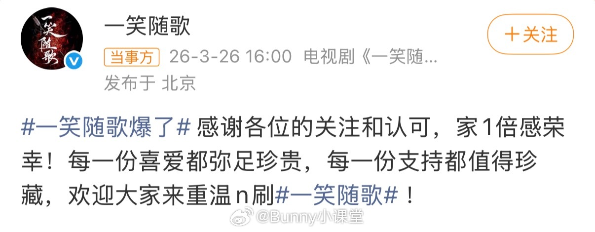 一笑随歌官博回应爆了:每一份喜爱都弥足珍贵,每一份支持都值得珍藏。感觉说了很多又感觉没说什么