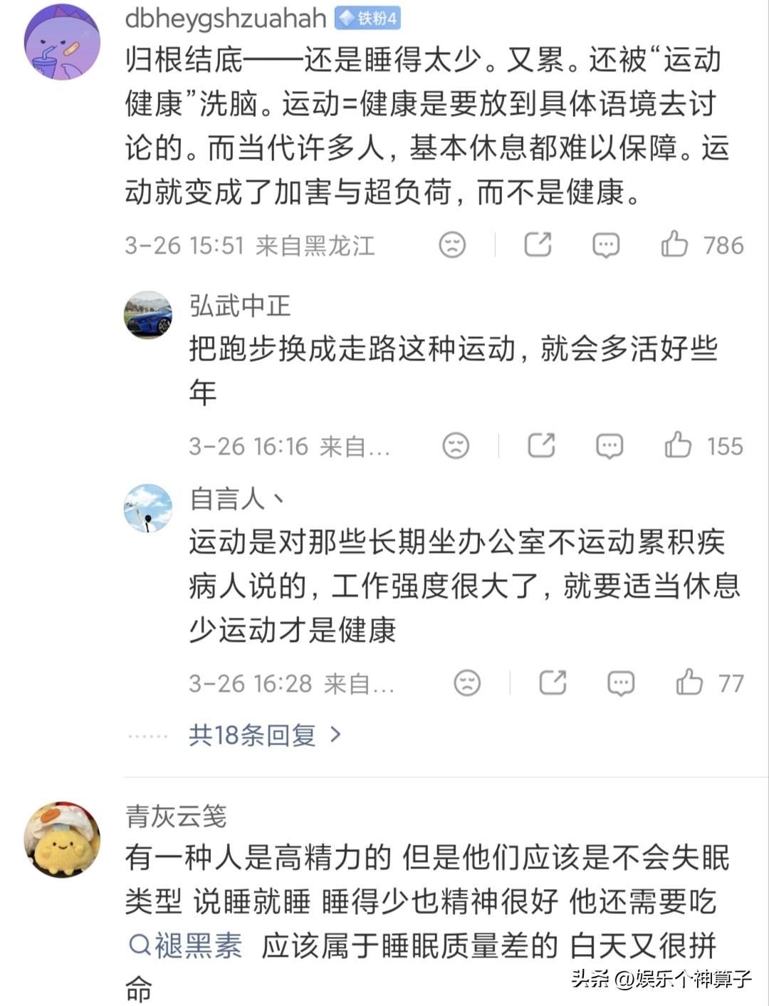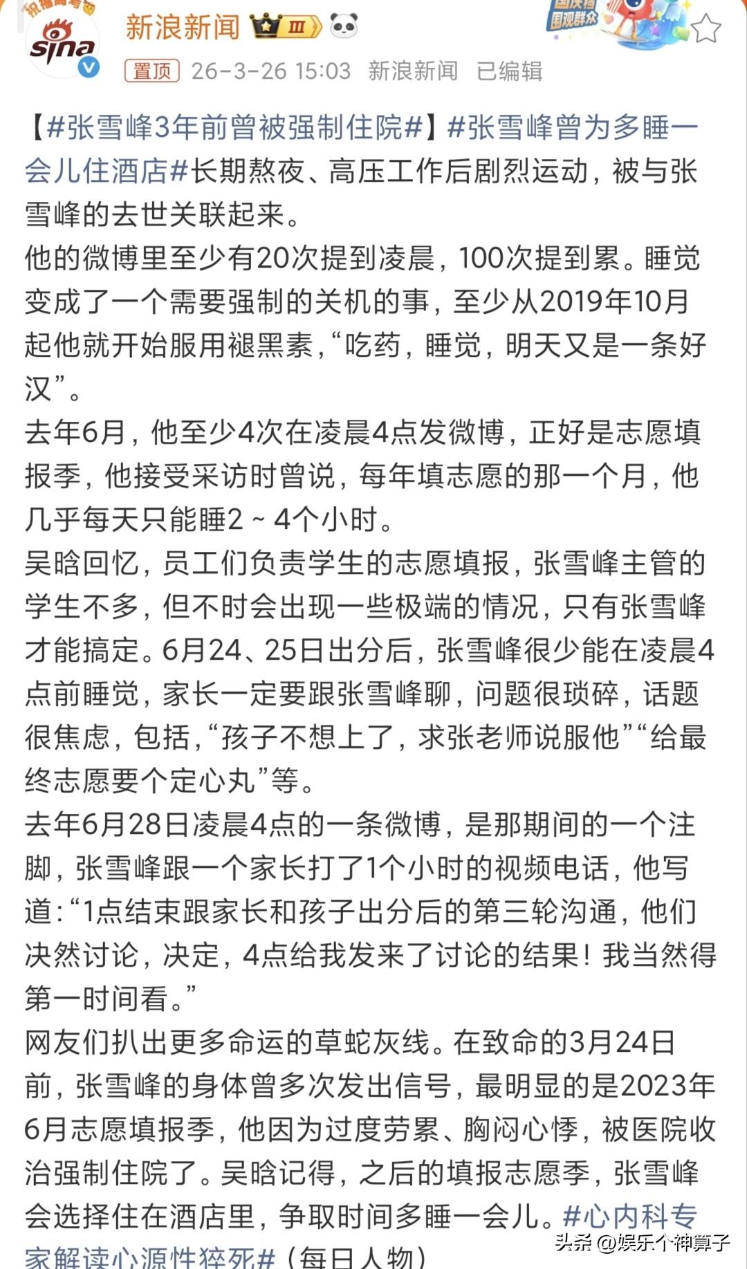 张雪峰老师生前太累了,睡觉都成了一种奢望! 3月26日,有媒体总结了张雪峰老师曾发布的博文,至少20次提到凌晨,100次提到累,甚至曾用“药物”来协助睡眠。 说实话,看完整个内容,有种莫名的心酸,以前没有特别关注张雪峰,每次在视频中,或者节目中,给人的感觉总是神采奕奕,状态还不错,把最好的一面呈现出来。 没想到,实际上这么累,就连想美美的睡上一觉,都成了一种奢望! 试想一下,如果一个人长期睡眠不足,会是怎样的感觉?尤其中年男子,照顾家庭,还要打拼事业,处处操心…… 另外,今天,看到媒体报道,黄晓明、林志玲参加马拉松活动,甚至连70岁的吕良伟也来了。 这些明星的年龄与张雪峰相比,有些稍微年长,也有相仿,每个人都精神饱满,就连吕良伟的状态都特别好,可见,只要睡眠充足,适当的运动,对身体并无害处。 再有,张雪峰曾在朋友圈透露,参加马拉松名额被取消,按理说,才41岁,不至于体检不合格,或许当时已经有些不对劲了。 可以说,张雪峰老师去世,让很多人沉浸在悲痛中,同时也给大家提了一个醒,不要让自己太累,保持睡眠,发现身体不适,及时做检查,千万不要硬扛。 毕竟,只有身体健康,做任何事才有意义!